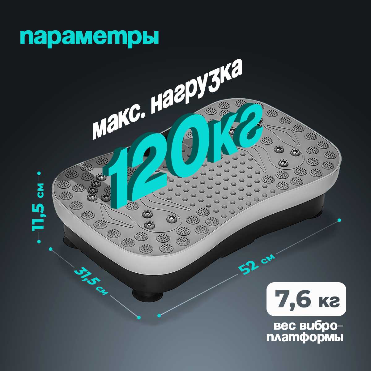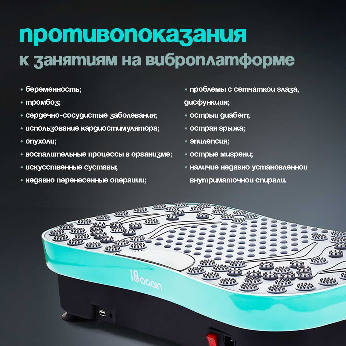 - Вибрация не заменяет активные кардио/силовые тренировки – результаты в сбросе веса возможны только в комбинации с диетой и фитнесом.