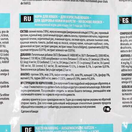 - Производитель четко указывает страну-изготовитель (Канада, Франция) и основной состав (лосось), что позволяет осознанно выбирать продукт.