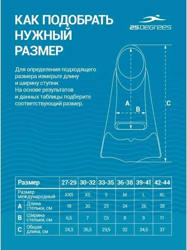 Точность размеров и стабильность фиксации: Большинство пользователей подтверждают соответствие размерной сетки заявленным параметрам, особенно при выборе точного размера стопы. Ласты маркировки 40-42 подошли для ноги 25,5 см, а 42-44 оказались великоваты для 43,5 размера, образуя зазоры в зоне пятки и подъёма. При узкой стопе возможно использование на размер больше без потери функциональности, однако в динамичных условиях (резкое отталкивание, интенсивный гребок) отмечались случаи сползания. Модель демонстрирует адаптивность к семейному использованию: эластичный материал позволяет одной парой пользоваться людям с разными параметрами стопы, включая детские и взрослые размеры. Для стоп шириной 37 размера требуется выбирать ласты на размер больше во избежание натирания, тогда как широкую стопу они охватывают комфортно. Вода может проникать под подошву при активном плавании, что некоторые пользователи расценивают как конструкционный недостаток.