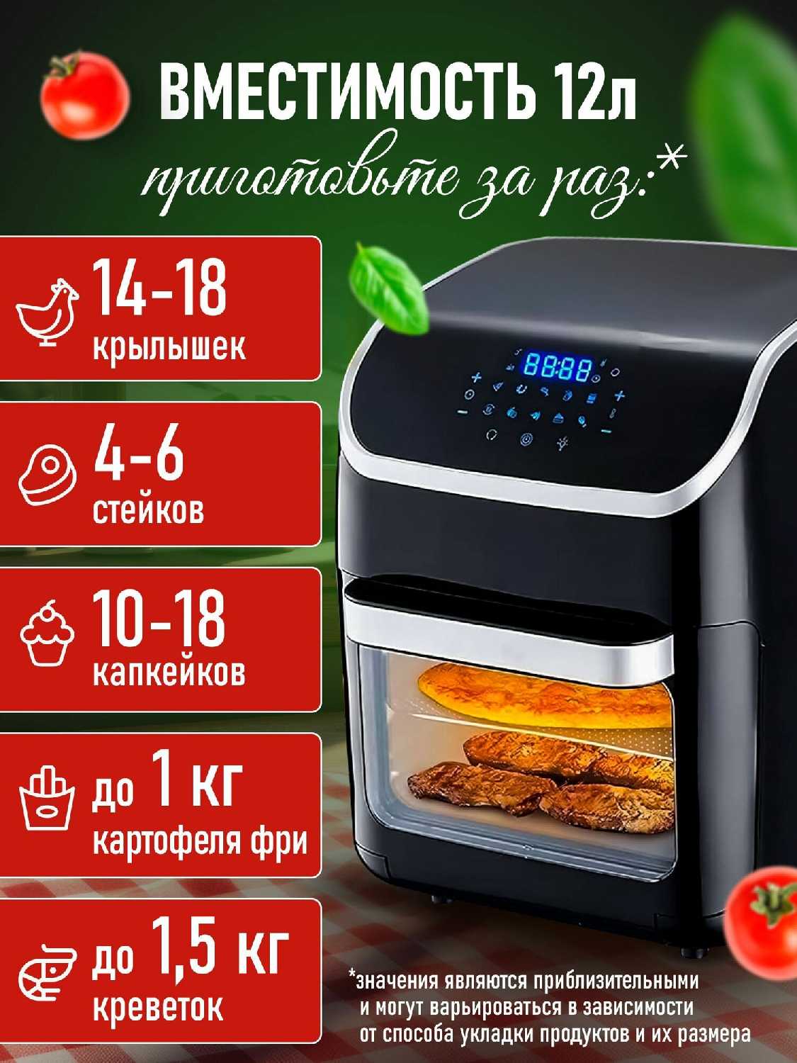 Большой объем подходит для семьи: помещается курица до 1,7 кг, несколько картошин дольками или стейки одновременно на нескольких уровнях. Полный набор аксессуаров (сетчатый барабан для фри, вертел, решетки, 2-3 противня для масла, книга рецептов) избавляет от докупок. Барабан упрощает фри без помешивания, если правильно установить (левая сторона штифта соприкасается). Противни без сеток иногда не держатся стабильно, вертел проскакивает при неправильной сборке (исправляется стягиванием шнурком). Отдельные случаи недокомплекта (одна сетка вместо двух).