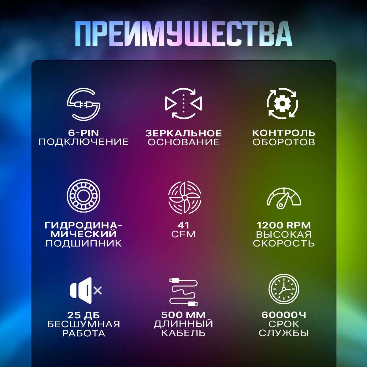 - Направление вращения лопастей оптимизировано для вдува/выдува, улучшая циркуляцию воздуха в системнике и охлаждая дополнительные компоненты вроде усилителей.