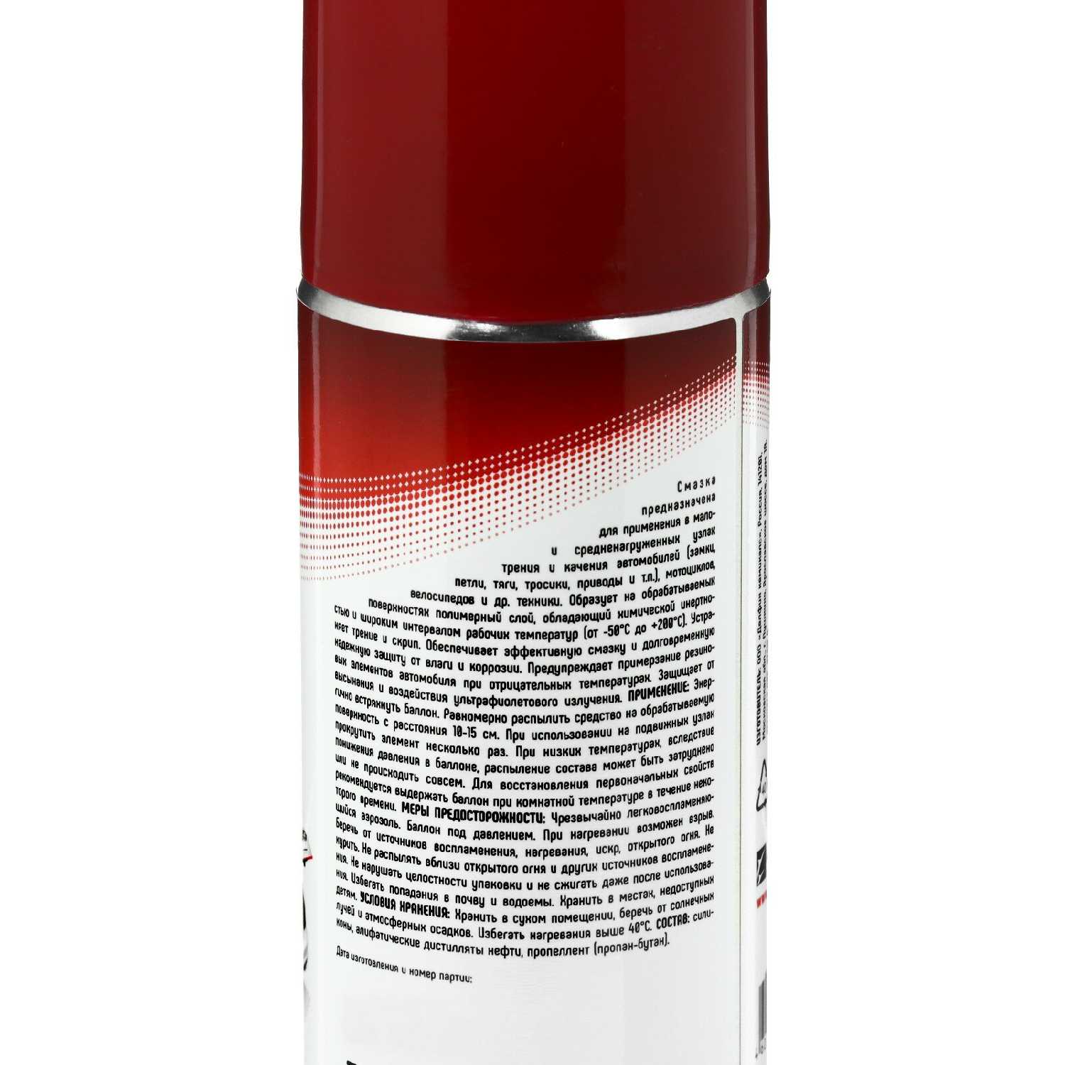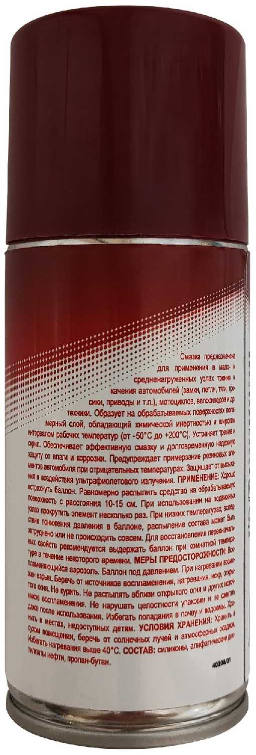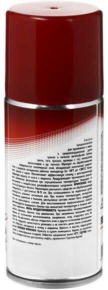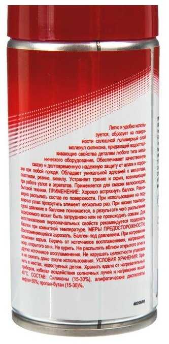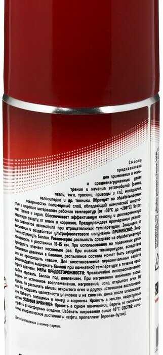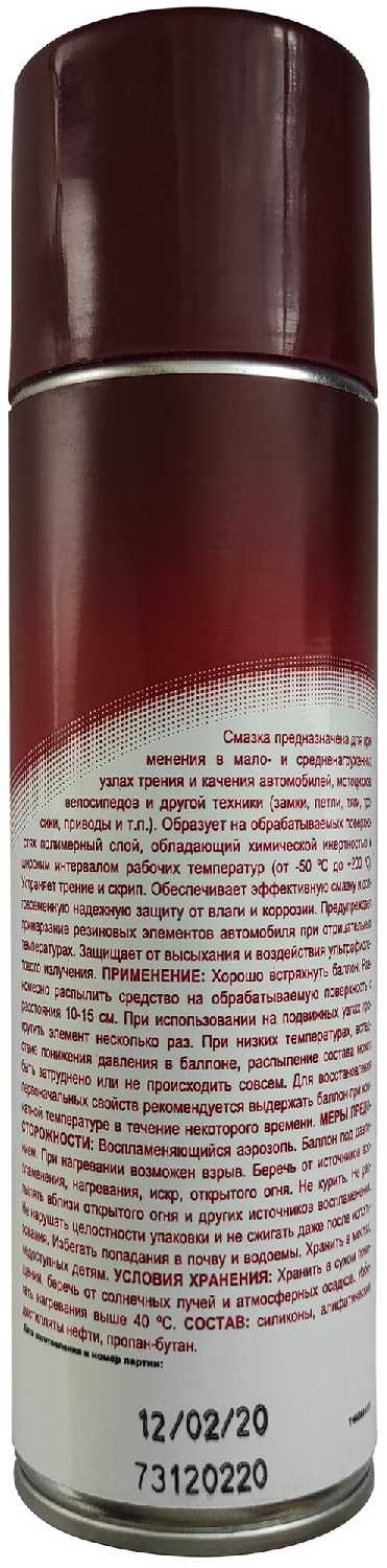 Способ применения : | Энергично встряхнуть баллон. Равномерно распылить средство на обрабатываемую поверхность с расстояния 10-15 см. При использовании на подвижных узлах прокрутить элемент несколько раз. При низких температурах, вследствие понижения давления в баллоне, распыление состава может быть затруднено или не происходить совсем. Для восстановления первоначальных свойств рекомендуется выдержать баллон при комнатной температуре в течение некоторого времени. |