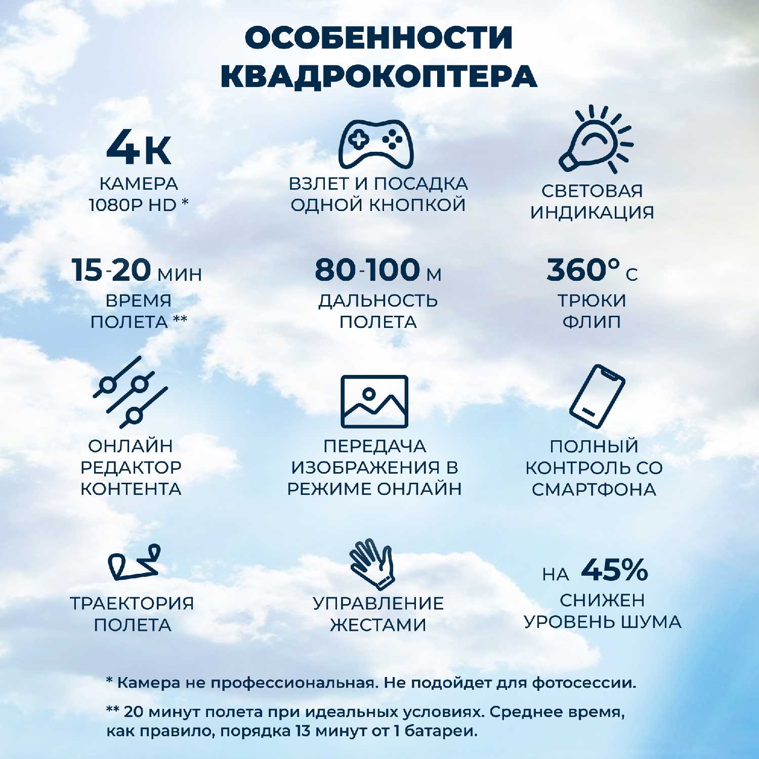 Дальность управления квадрокоптером составляет около 90 метров, что является стандартным показателем для данного класса устройств. Время непрерывного полета от одного аккумулятора варьируется от 12 до 15 минут в зависимости от условий. В комплекте поставляется три аккумулятора, что суммарно дает около 40-45 минут летного времени с перерывами на замену. -