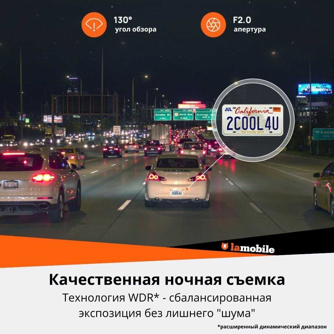 - Угол обзора 130° захватывает несколько полос, улучшая охват событий без необходимости корректировки позиции устройства.