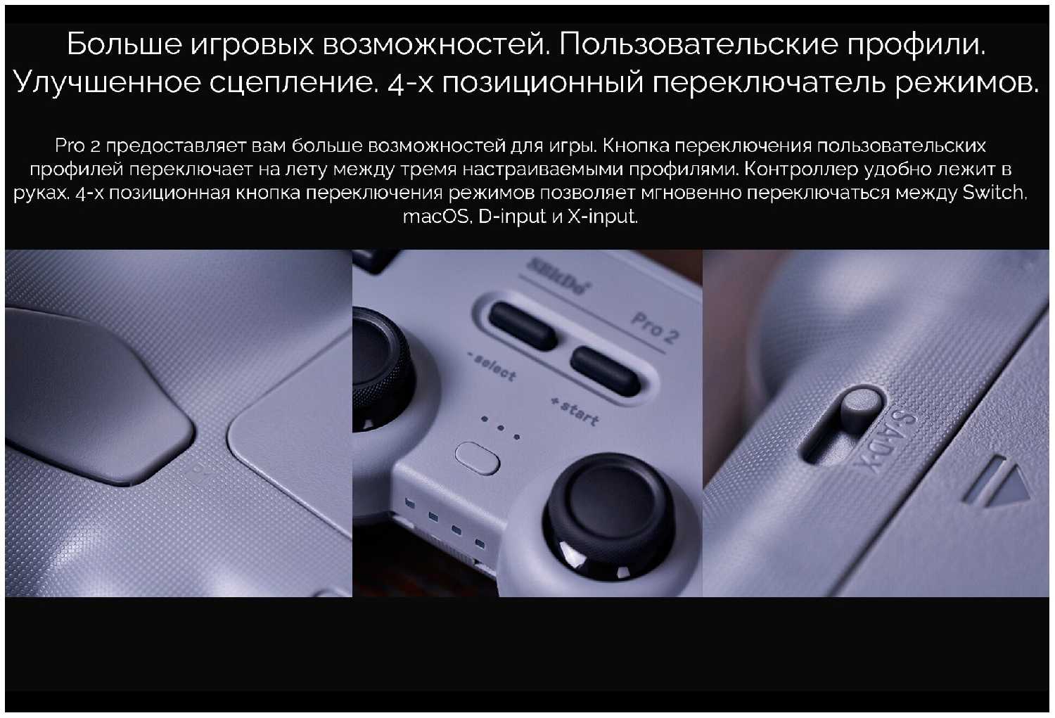 - Поддержка 4 режимов подключения: X (Xbox для ПК), S (Nintendo Switch), A (macOS/Android), D (DirectInput).