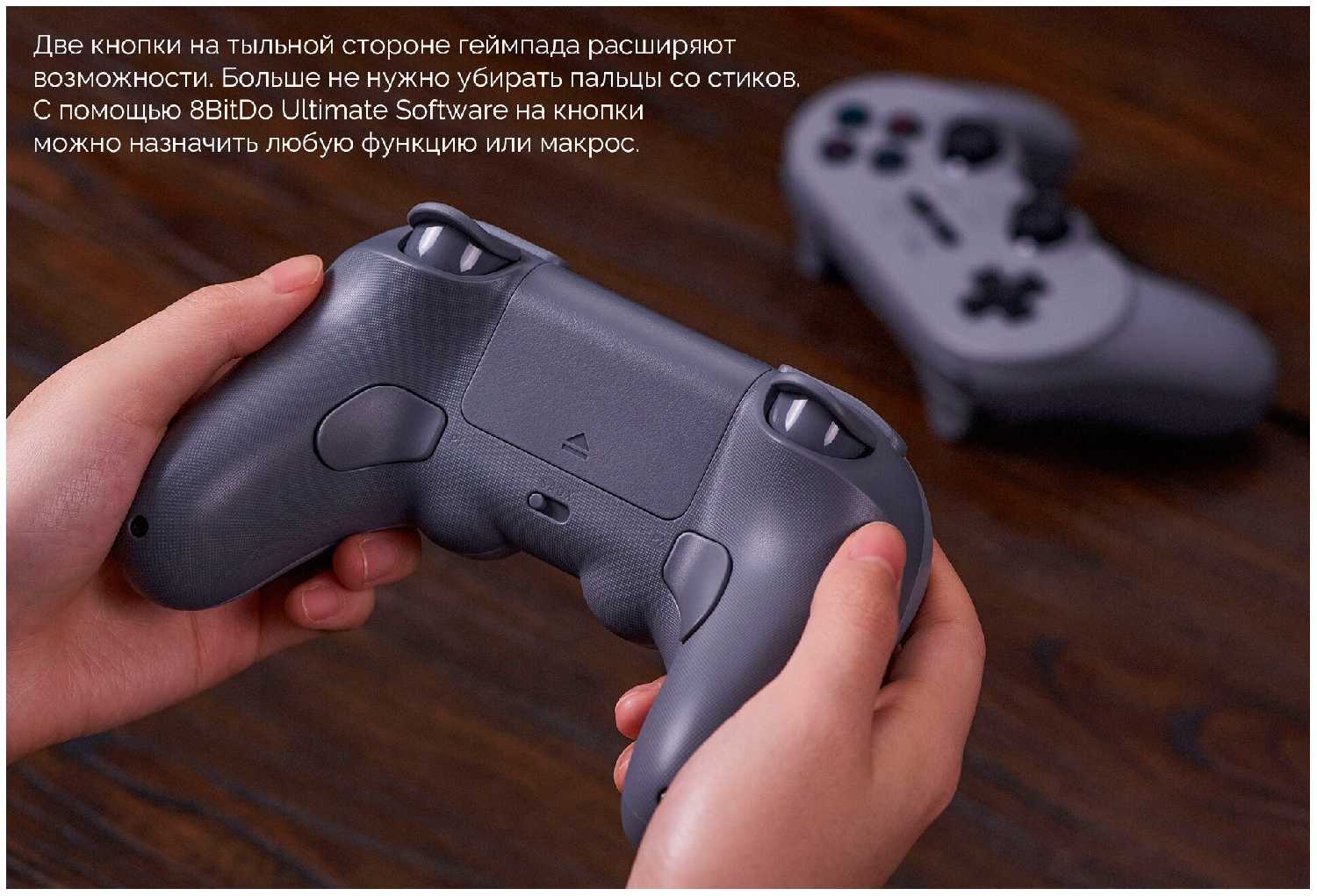Геймпад выделяется беспрецедентной универсальностью с четырьмя режимами подключения: X-Input (Xbox 360 для ПК), D-Input (Android), S-mode (Nintendo Switch) и macOS. Гироскоп работает исключительно в S-режиме, где также доступна корректная эмуляция HD Rumble. Прошивка v2.01+ устранила проблемы с дрифтом стиков в Switch-режиме при проводном подключении, однако беспроводное соединение с ПК под Linux требует повторного сопряжения после каждого отключения. На ПК через Steam Input гироскоп успешно применяется для управления камерой в шутерах. Дополнительные кнопки P1/P2 программируются на дублирование любых действий или макросы через Ultimate Software, сохраняя профили во внутреннюю память. Аккумулятор ёмкостью 1000 мАч обеспечивает до 20 часов работы, а возможность замены на AA-батарейки продлевает жизненный цикл устройства.