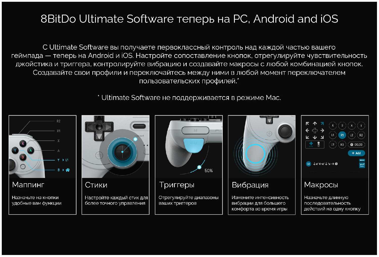 - Программное обеспечение Ultimate Software позволяет переназначать кнопки, настраивать мертвые зоны стиков (от 0,1% по умолчанию) и силу вибрации.