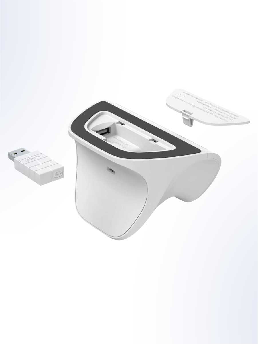 Док-станция не только заряжает геймпад, но и служит ресивером для подключения по радиоканалу 2.4 ГГц при подключении к ПК через USB. Она автоматически выключает геймпад при установке на зарядку и мгновенно подключает его к ПК при снятии. Внутри станции расположен порт для скрытого хранения беспроводного адаптера, что экономит USB-порт на компьютере. -