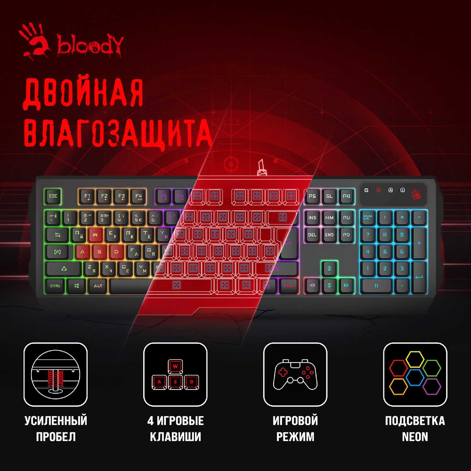 Мембранная конструкция с герметичной изоляцией и дренажными отверстиями в корпусе обеспечивает базовую защиту: после случайного залития водой или сладкими напитками клавиатура сохраняет работоспособность после просушки (некоторые пользователи сушили её феном или естественным способом). Однако под клавишами могут оставаться залипания, а под корпусом — скапливаться остатки жидкости, поэтому полное погружение под кран не рекомендуется и может привести к поломке. -