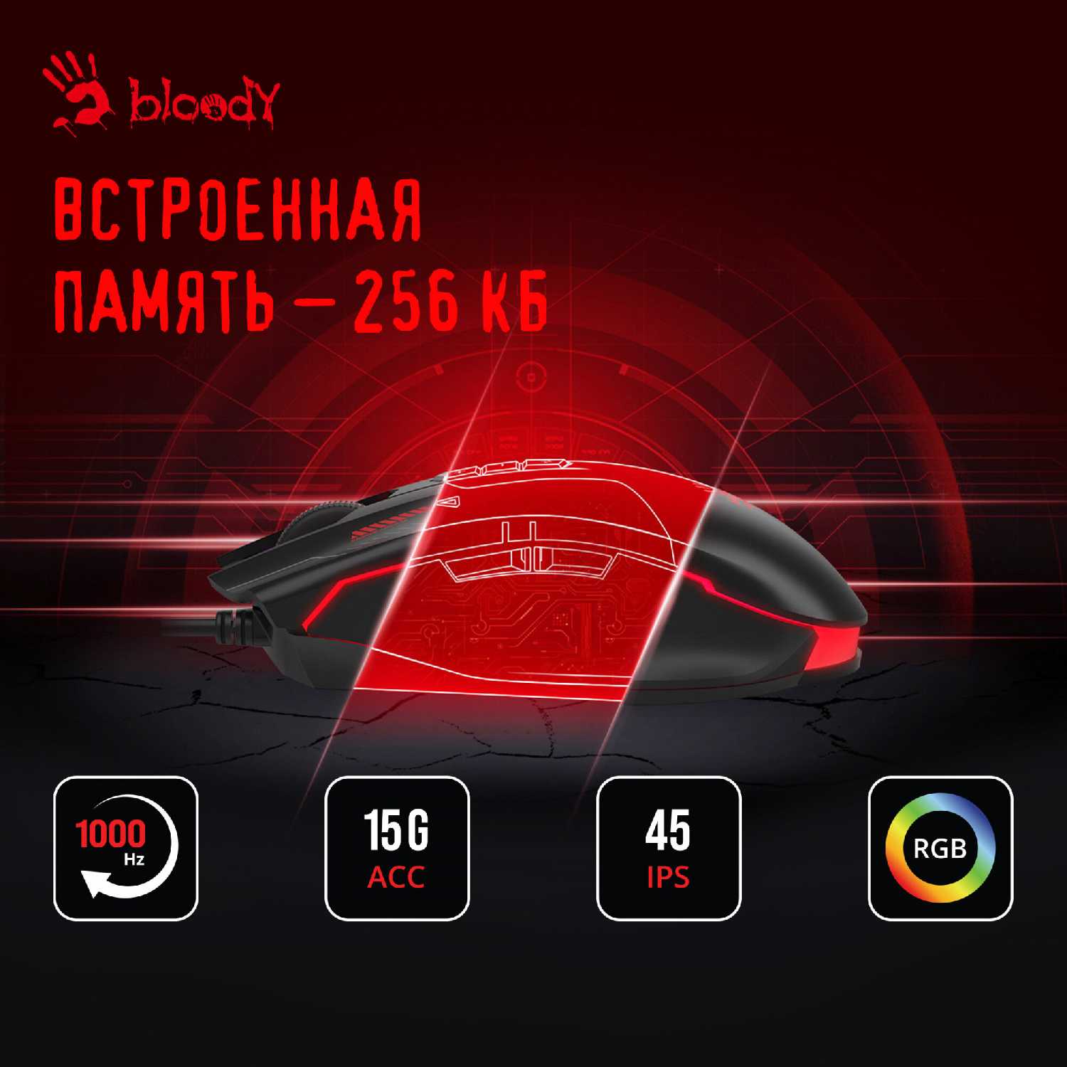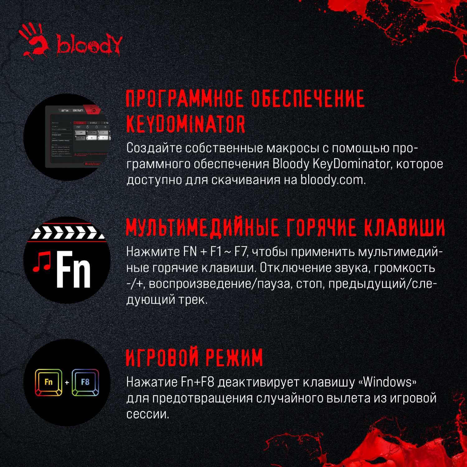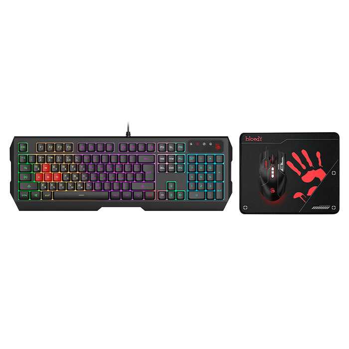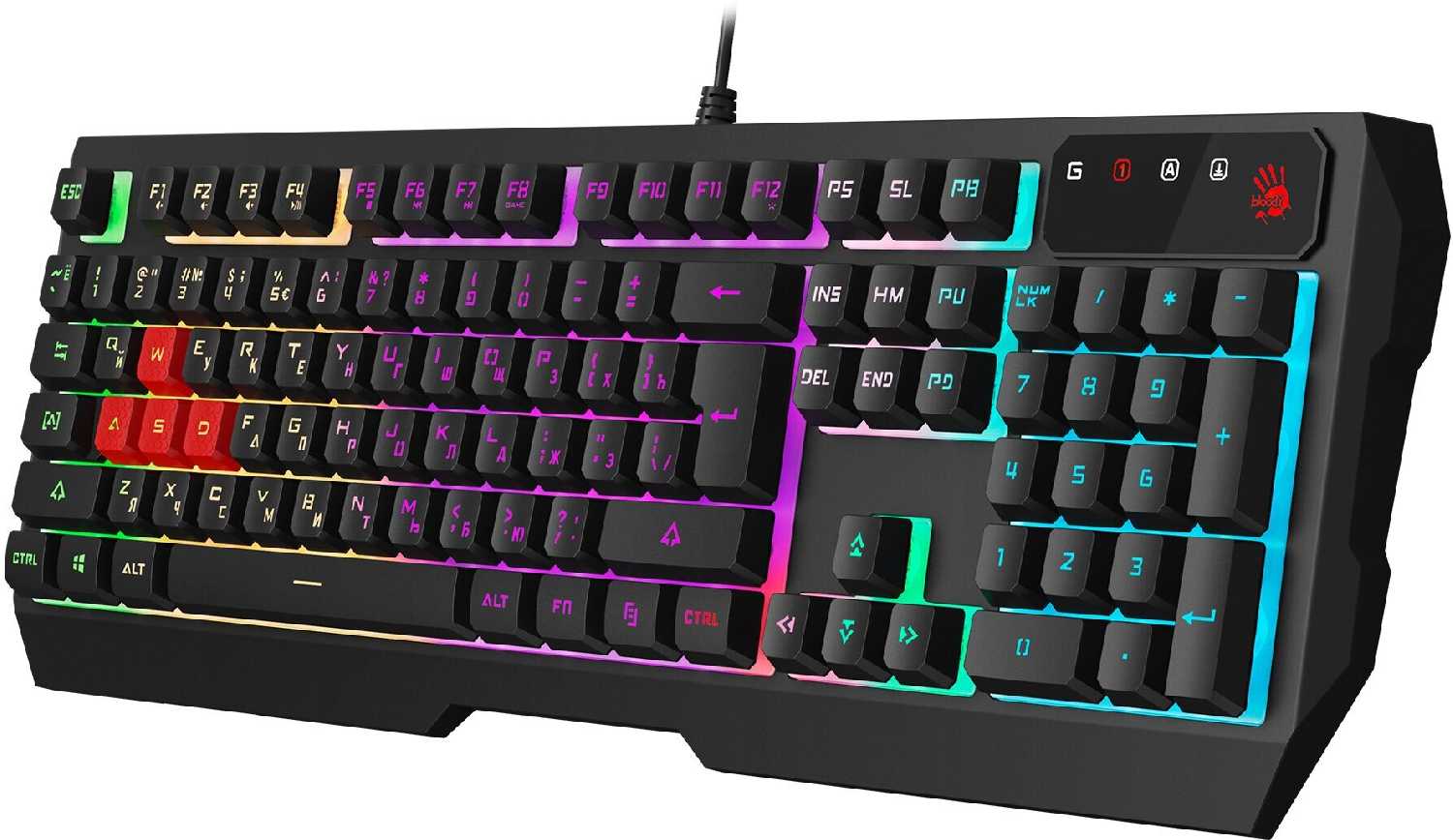 Подсветка клавиатуры расположена между клавишами, а не под символами, что затрудняет использование в темноте: буквы не подсвечиваются, виден только контур кнопок. В ярко освещённой комнате символы на клавишах тускнеют. Режимы подсветки ограничены: постоянное свечение, пульсация и отключение. Глянцевый пластик корпуса бликует, маскируя надписи. Мышь имеет анимированную RGB-подсветку, но её нельзя синхронизировать с клавиатурой. Красные клавиши WASD и агрессивный дизайн с логотипом «Bloody» нравятся подросткам, но выглядят избыточно в офисной среде.