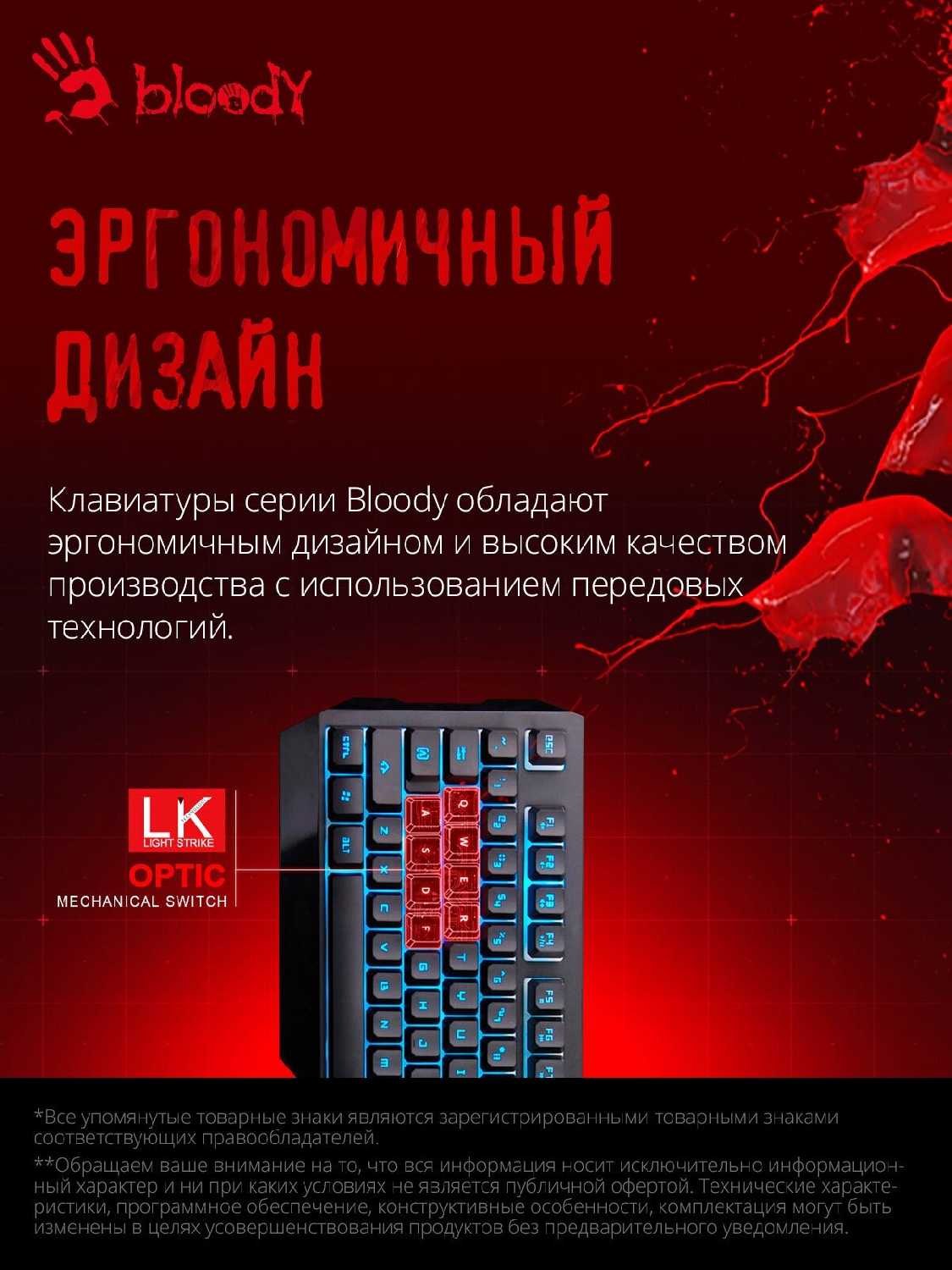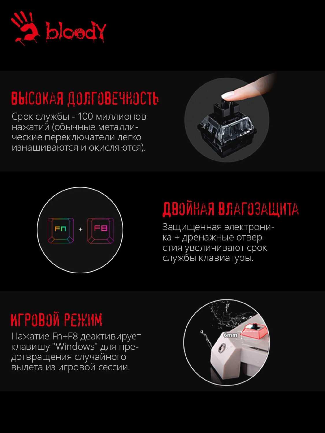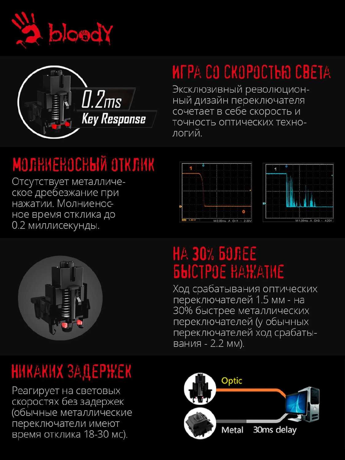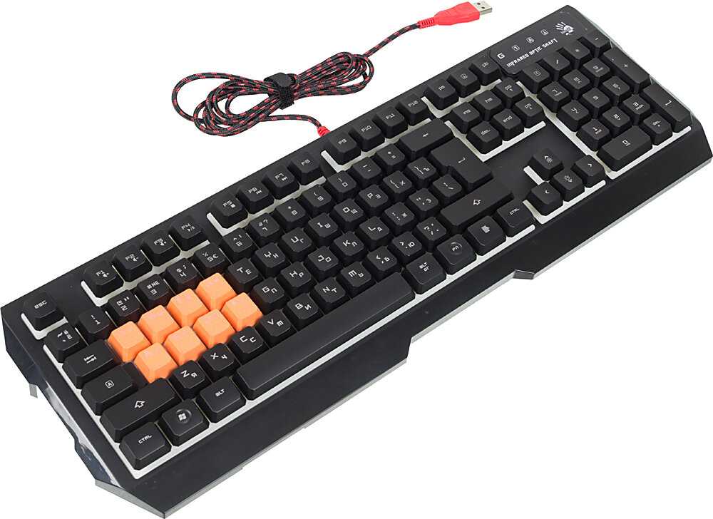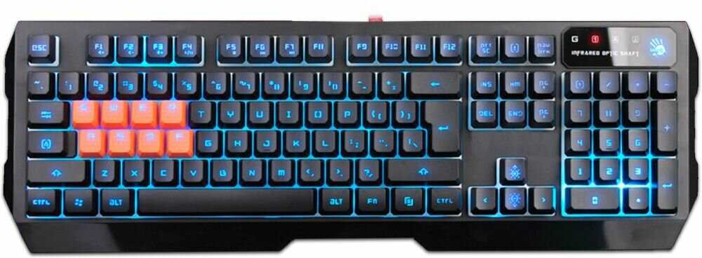 Восемь выделенных оранжевых клавиш используют оптические переключатели собственного производства A4Tech, которые обеспечивают более быстрое и четкое срабатывание по сравнению с обычными мембранными. Ход этих клавиш легче и короче, что критично для мгновенной реакции в динамичных играх. Однако их звук, хотя и громче, чем у мембранных, не такой громкий и щелкающий, как у классической механической клавиатуры, что делает их приемлемыми для использования в ночное время. -