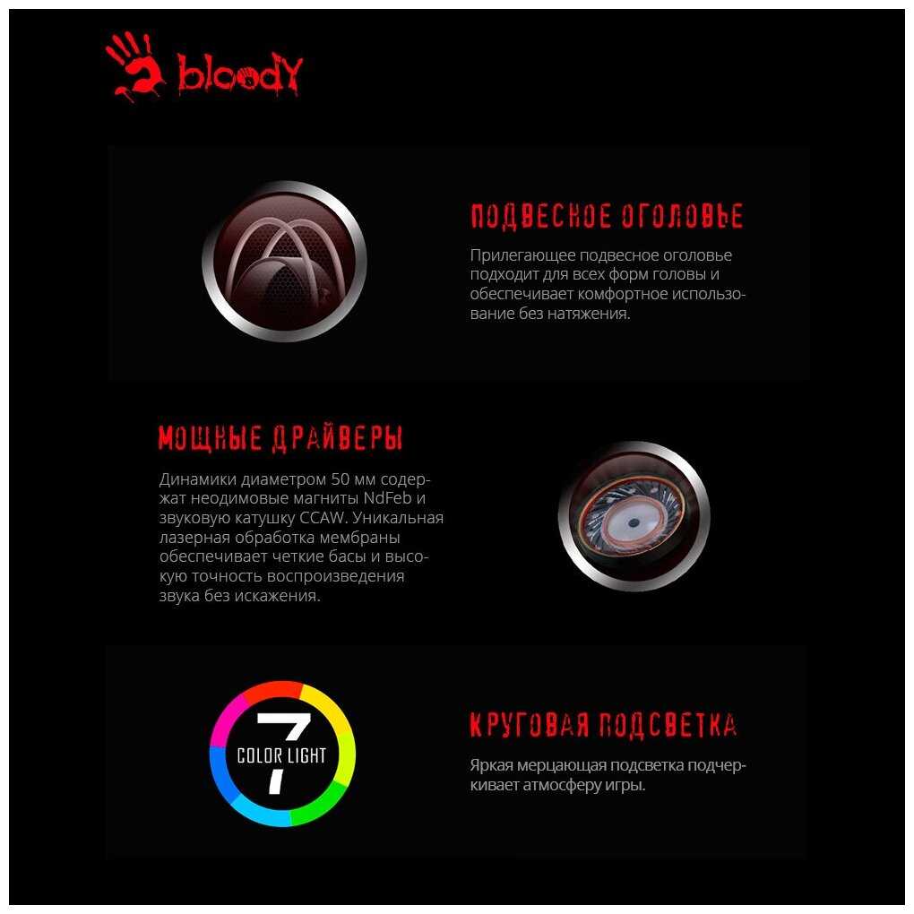 Штатное ПО A4Tech (Nahimic, Bloody) не распознает данную модель – управление подсветкой и эквалайзером недоступно. Пользователи вынуждены использовать системные инструменты Windows или сторонние эквалайзеры (например, в браузере для VK). Микрофон требует ручной активации AGC в настройках ОС. -