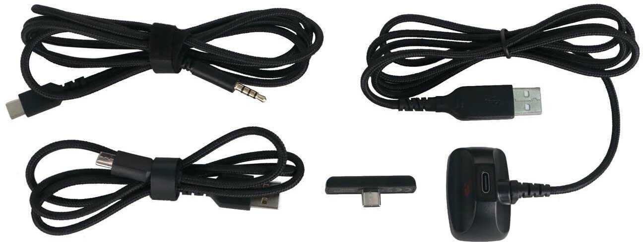 В комплекте пользователи обнаруживают сами наушники, съемный микрофон, беспроводной приемник (донгл) 2.4 ГГц, кабель для зарядки (USB-C), кабель для проводного аудиоподключения (USB-C to 3.5 mm jack) и USB-удлинитель для приемника. Важно отметить, что в комплекте идет именно удлинитель, а не док-станция для зарядки, как могут ожидать некоторые. Кабель для проводного подключения не передает сигнал микрофона — он работает только при беспроводном или USB-подключении.