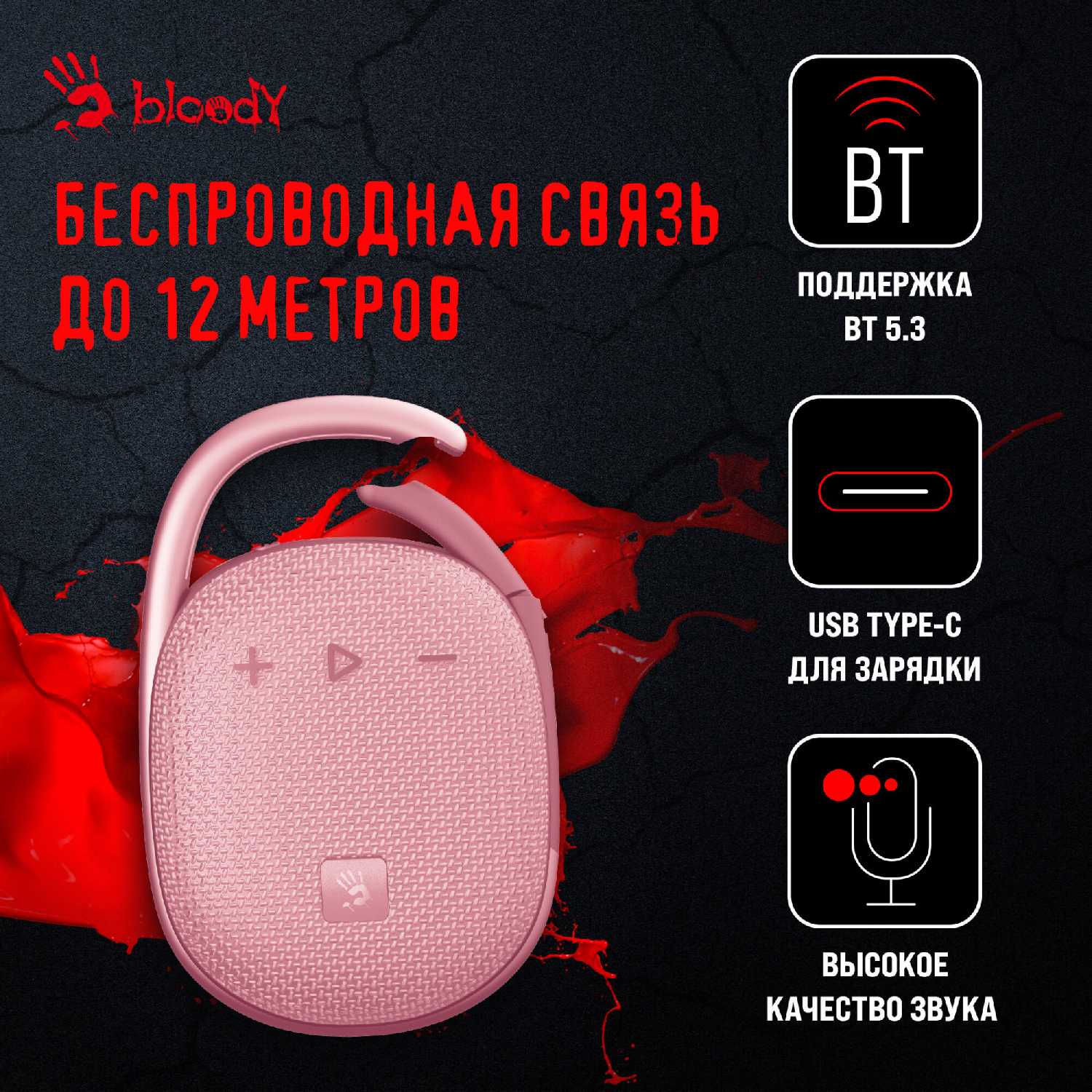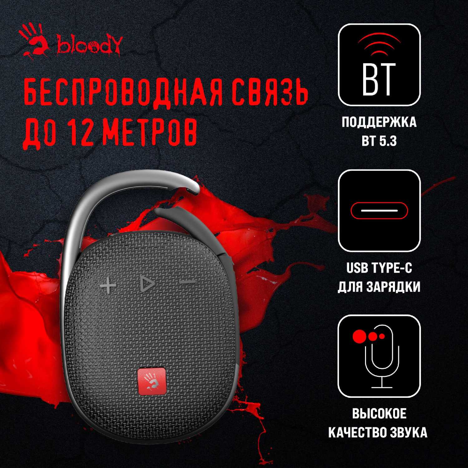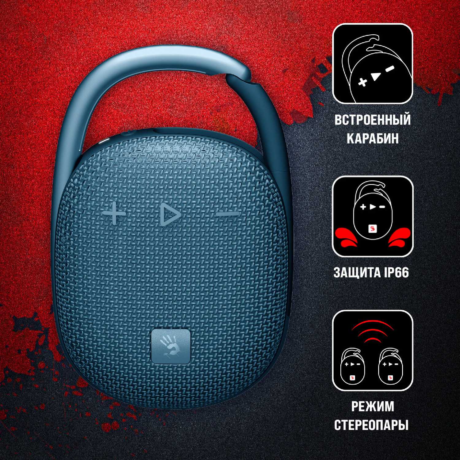 Конструкция, защита и эргономика Корпус сочетает пластик и ткань с полноценной защитой от влаги и пыли (стандарт IP67 упоминается косвенно), что подтверждается эксплуатацией под дождем и в мастерских с сохранением работоспособности. Карабин обеспечивает надежное крепление к рюкзакам, велосипедным рамам и сумкам — пользователи подчеркивают отсутствие самопроизвольного расстегивания даже при тряске. Габариты (помещается в ладонь) и вес (~20 г тяжелее JBL Clip 4) оптимизированы для переноски, но отмечается скольжение на гладких поверхностях из-за формы основания. Кнопки управления громкостью и питанием расположены на лицевой панели, причем кнопка включения смещена к карабину, что требует привыкания.