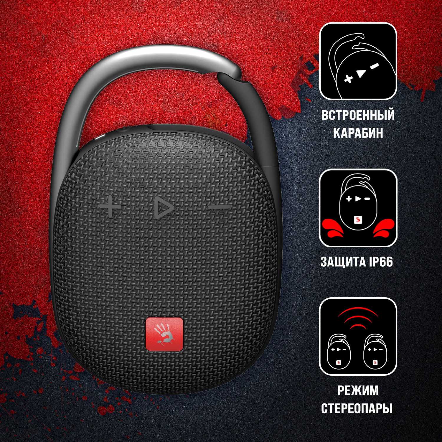Конструкция, защита и эргономика Корпус сочетает пластик и ткань с полноценной защитой от влаги и пыли (стандарт IP67 упоминается косвенно), что подтверждается эксплуатацией под дождем и в мастерских с сохранением работоспособности. Карабин обеспечивает надежное крепление к рюкзакам, велосипедным рамам и сумкам — пользователи подчеркивают отсутствие самопроизвольного расстегивания даже при тряске. Габариты (помещается в ладонь) и вес (~20 г тяжелее JBL Clip 4) оптимизированы для переноски, но отмечается скольжение на гладких поверхностях из-за формы основания. Кнопки управления громкостью и питанием расположены на лицевой панели, причем кнопка включения смещена к карабину, что требует привыкания.