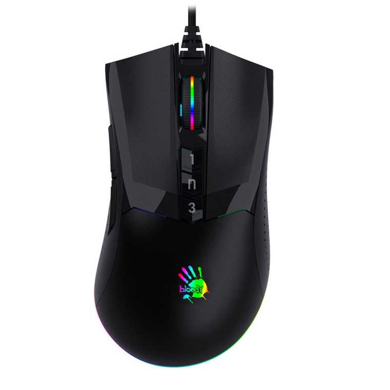 Модель обладает расширенным функционалом, включающим восемь программируемых кнопок, возможность записи и хранения макросов непосредственно во встроенной памяти объёмом 160 КБ, а также активированные по умолчанию режимы Ultra Core 3 и 4 (включая компенсацию отдачи и автоматическое удержание дыхания в снайперском режиме), что избавляет от необходимости дополнительной покупки лицензии. Фирменное программное обеспечение Bloody 7 предоставляет глубокий уровень кастомизации: настройку подсветки (16.8 млн цветов с выбором зон подсветки), создание профилей для разных приложений, регулировку частоты опроса (125/500/1000 Гц), калибровку сенсора под конкретный коврик и назначение сложных макросов. Однако интерфейс ПО оценивается большинством как неинтуитивный, перегруженный и требующий значительного времени на освоение по сравнению с аналогами от Razer; настройка подсветки, в частности, выделяется как особенно неудобный раздел. Динамическая мультицветная подсветка реализована ненавязчиво, подсвечивая только колесо прокрутки и логотип, но её неравномерность из-за редкого расположения светодиодов отмечается как эстетический недостаток.