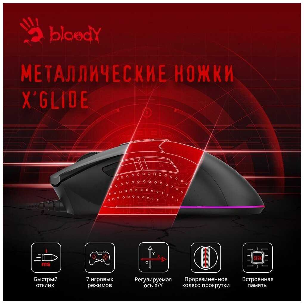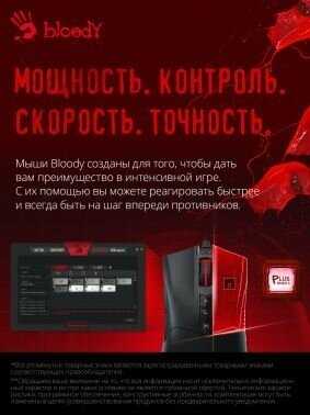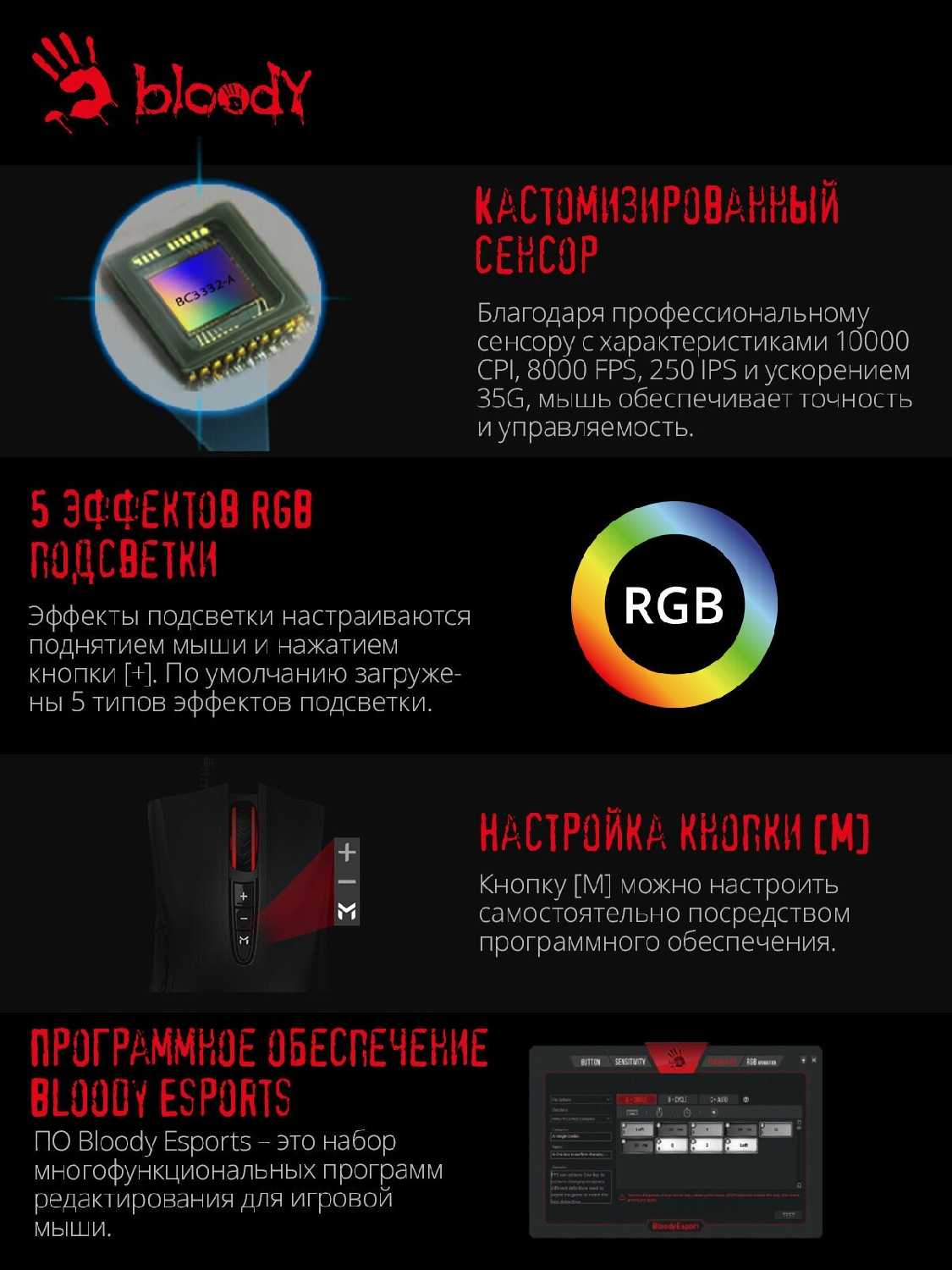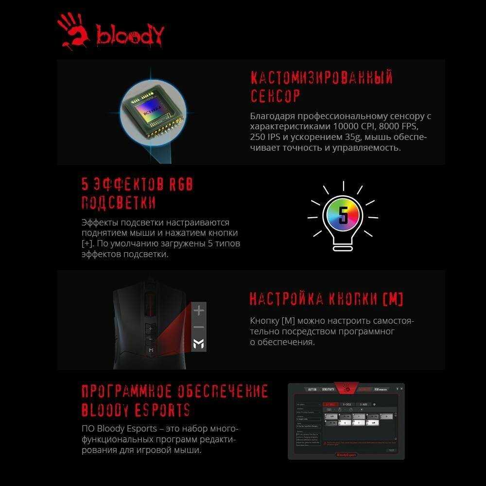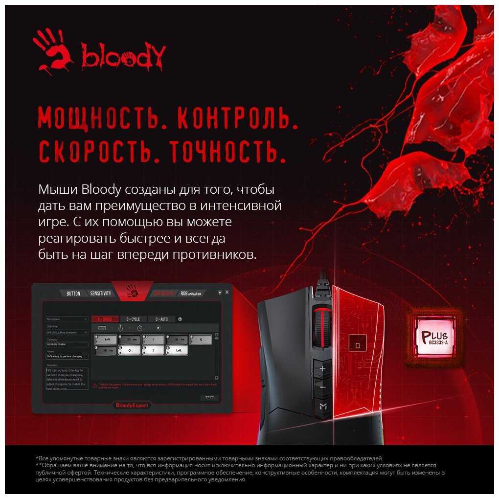 Фирменное ПО Bloody Esports позволяет детально настраивать RGB-подсветку (индивидуально для 15 зон), назначать макросы на 7 программируемых кнопок и регулировать LOD (высоту отрыва сенсора). Однако интерфейс переведён только на английский, а анимации подсветки сбрасываются после переподключения. Пользователи хвалят возможность сохранять профили во встроенной памяти мыши, но критикуют отсутствие функции полного отключения подсветки без софта. Кнопки под корпусом для смены DPI и частоты опроса удобны, но их расположение провоцирует случайные нажатия при активном движении.