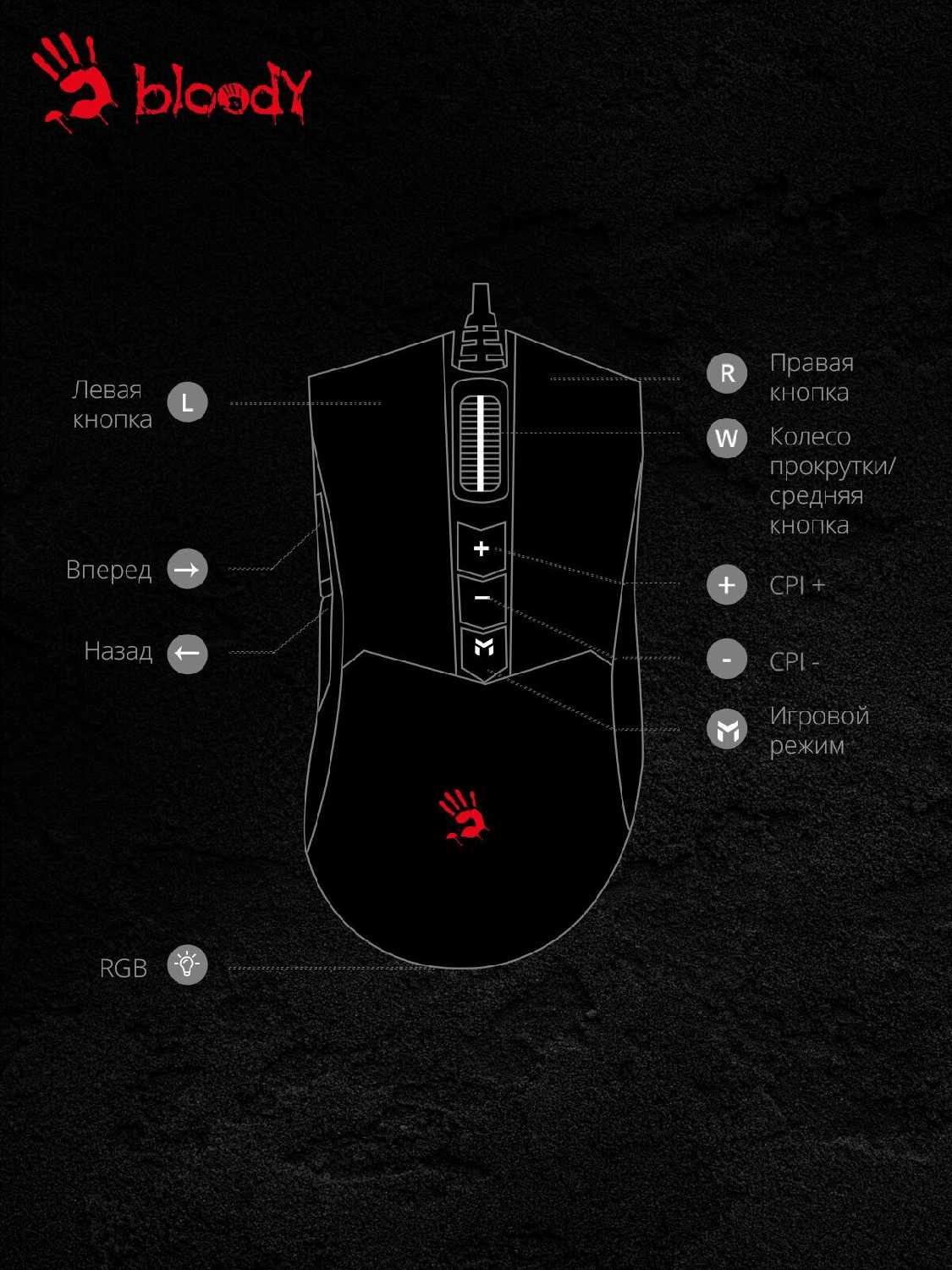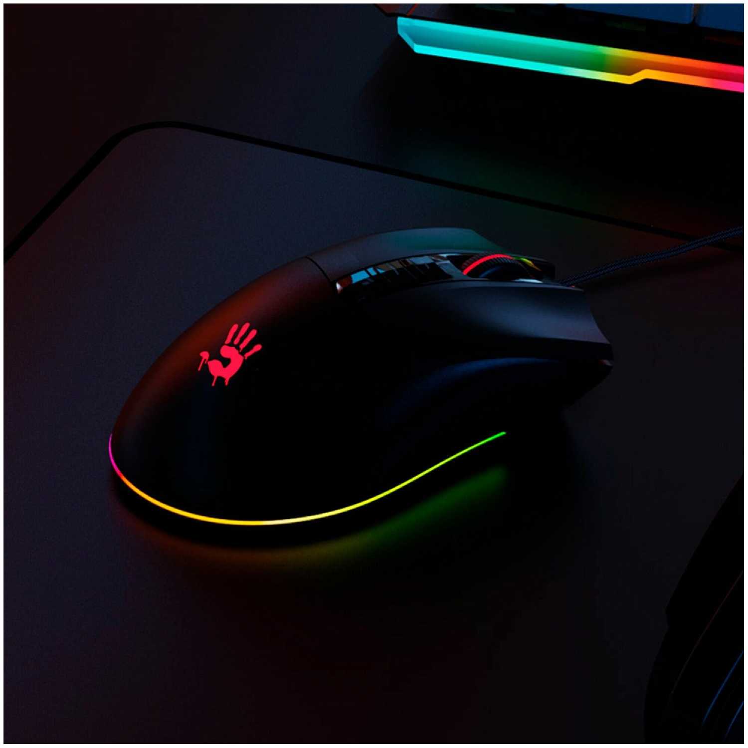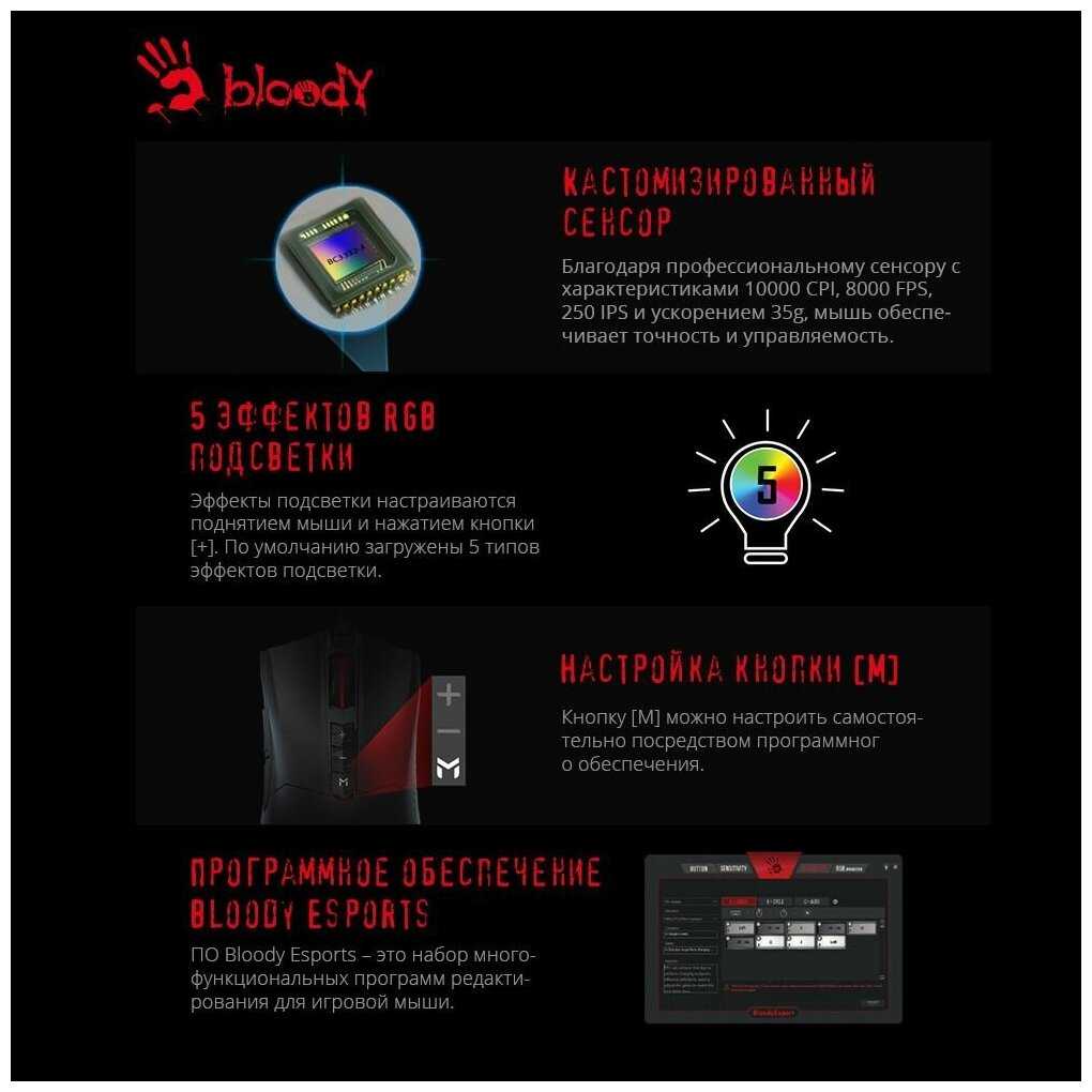 Фирменное ПО Bloody Esports позволяет детально настраивать RGB-подсветку (индивидуально для 15 зон), назначать макросы на 7 программируемых кнопок и регулировать LOD (высоту отрыва сенсора). Однако интерфейс переведён только на английский, а анимации подсветки сбрасываются после переподключения. Пользователи хвалят возможность сохранять профили во встроенной памяти мыши, но критикуют отсутствие функции полного отключения подсветки без софта. Кнопки под корпусом для смены DPI и частоты опроса удобны, но их расположение провоцирует случайные нажатия при активном движении.