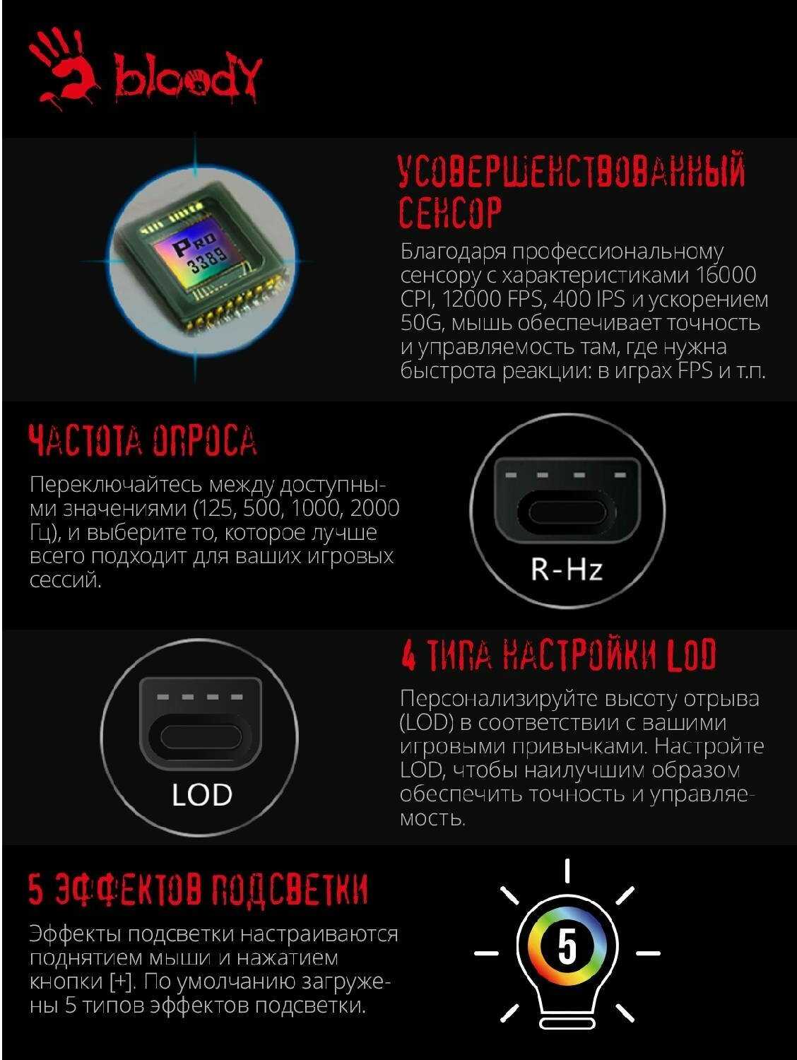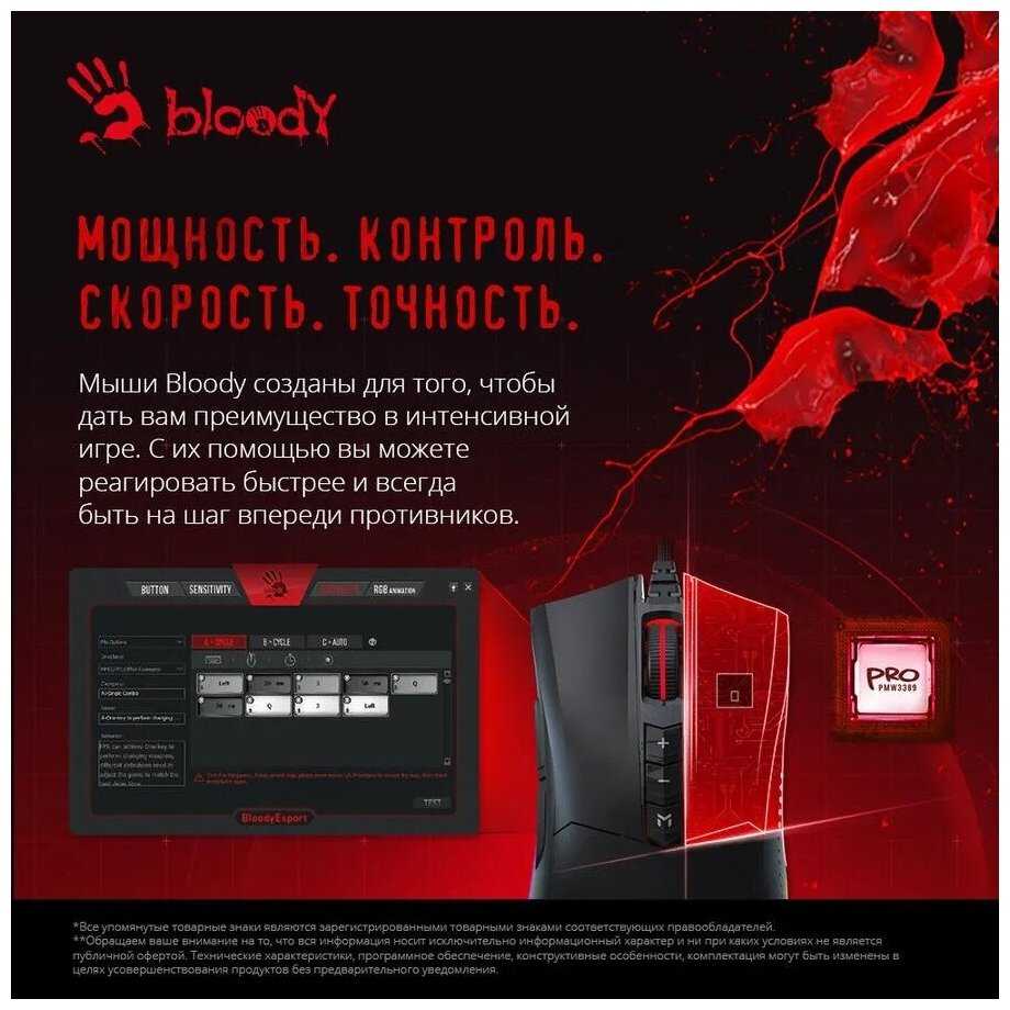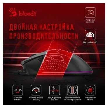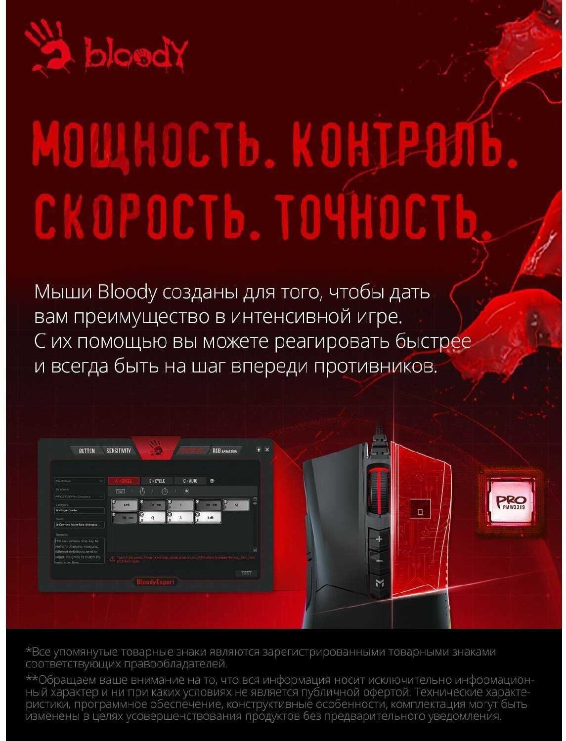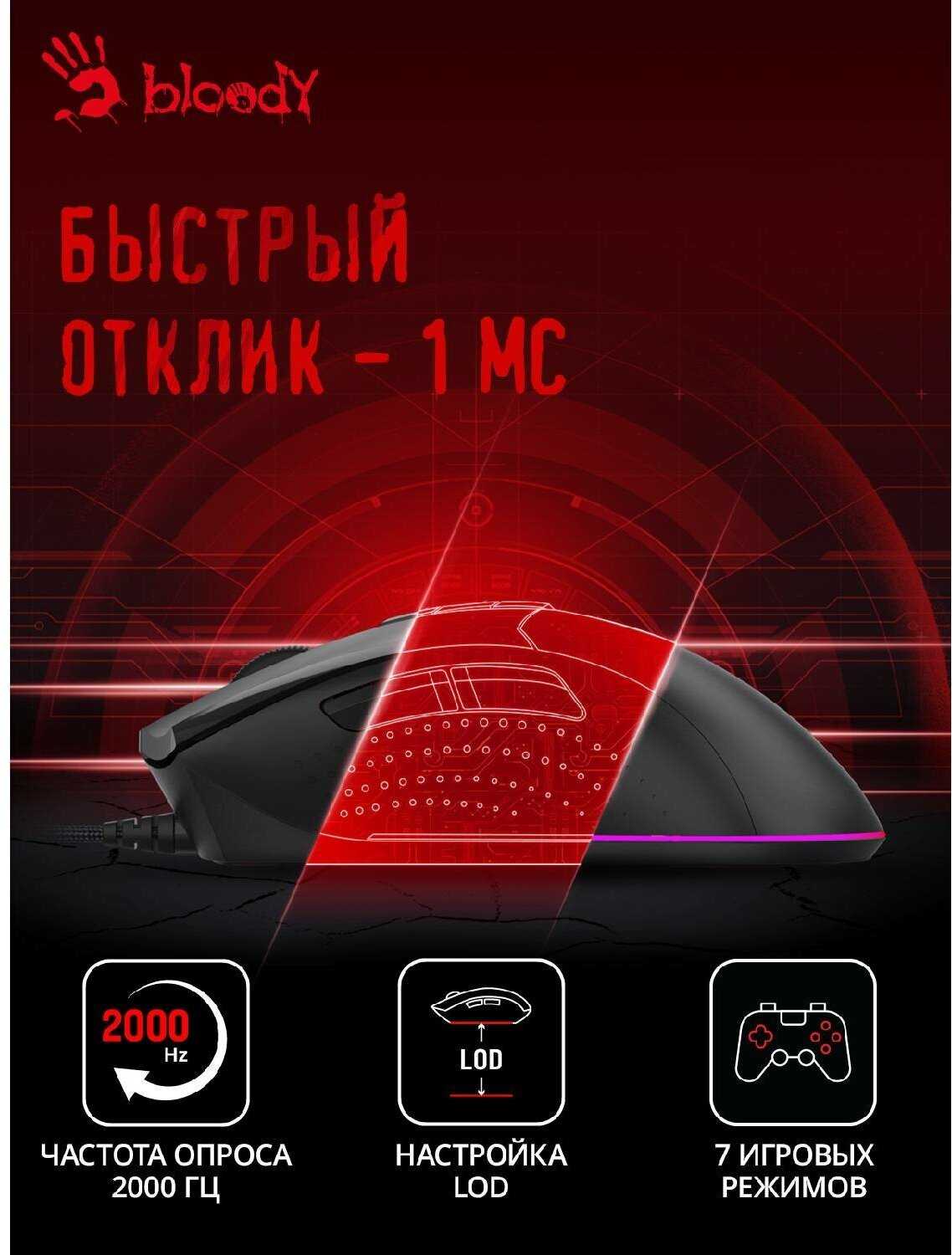 - 7 кнопок (включая профиль «М») с настройкой действий через Bloody Engine, включая сложные сценарии для игр.