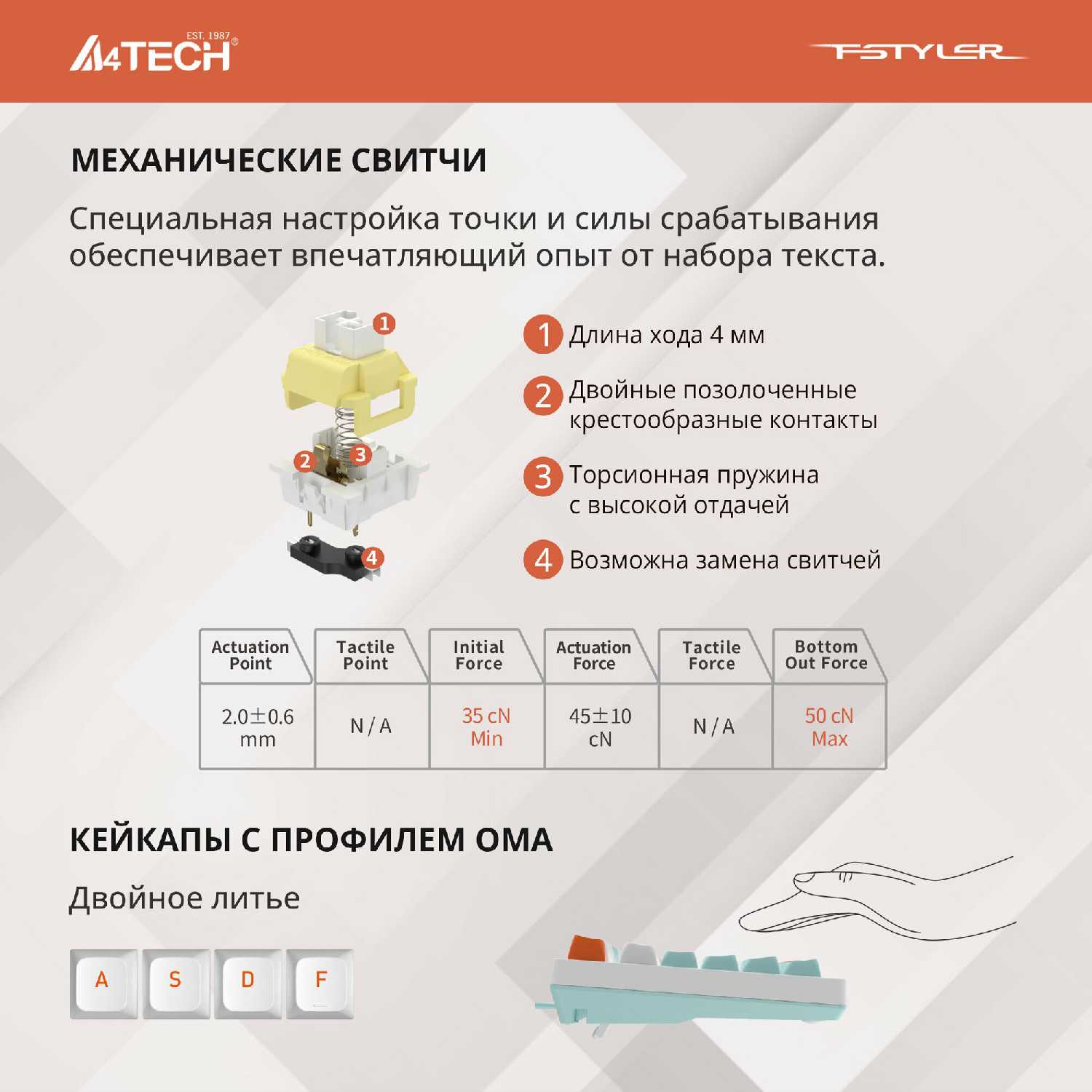 - Усилие срабатывания 45±10 г снижает утомляемость кистей при 8-часовой работе, подтверждено пользователями-программистами.