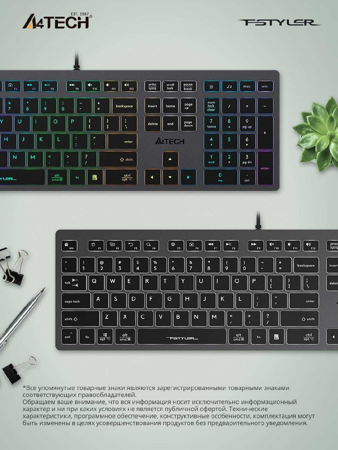 Кроме того, клавиатура A4TECH Fstyler FX60 имеет высокую степень надежности и долговечности. Клавиши выполнены из качественных материалов, что обеспечивает долгий срок службы. Клавиатура также легко чистится и не скользит на поверхности, что делает ее еще более удобной в использовании.