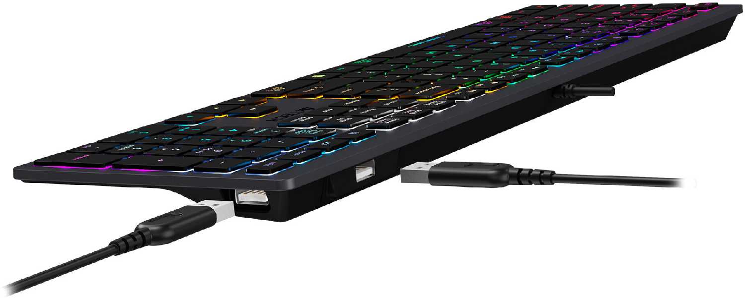 Качество сборки, обрезиненные клавиши с коротким ходом, не елозит по столу, регулируемые уровни подсветки, + 2 USB прям на клаве