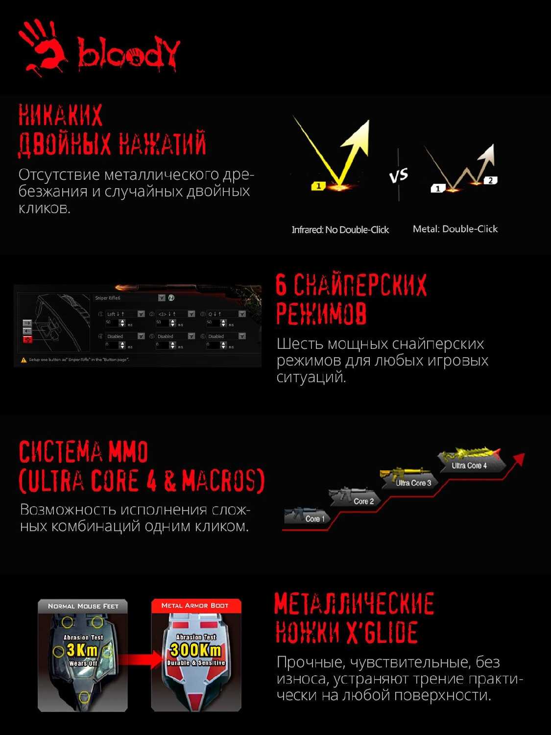 Для расширенной настройки (подсветка, кнопки, чувствительность DPI, калибровка сенсора) требуется фирменное ПО (упоминается как Bloody8). Большинство пользователей успешно его используют для настройки. Однако есть единичный, но важный отзыв о потенциальном конфликте: ПО Bloody8 в некоторых версиях может вызывать конфликты (вплоть до синего экрана - BSOD) при одновременной установке ПО от других производителей периферии (конкретно названо ПО Steelseries). -