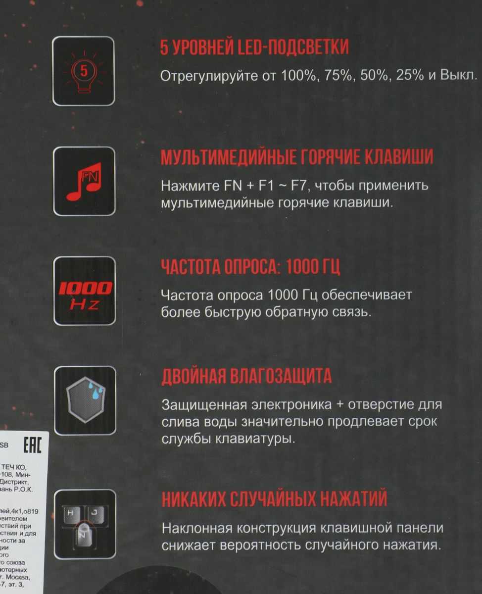регулируемая подсветка по бокам, нет подсветки самих кнопок, что значительно отвлекает во время игр, и самый жирный плюс, как по мне, это влагозащита, она тут на высоте, пользуюсь этой клавой уже более 2 лет, чего только не проливал на нее и алкогольные напитки и соки и просто воду и чай, один раз пролил пиво на клавиатуру (полностью залило), кнопки стали с трудом нажиматься, на свой страх и риск потащил под кран с водой, думал если сломается то новую куплю, промыл под напором холодной воды и вуаля, после просушки клавиатура начала работать как будто только с завода, с тех пор она у меня пару десятков раз подвергалась этой процедуре, все работает замечательно, жаль что племяшка отковырял клавишу шифт и капс лок и в итоге сломал их и самое обидное что шифт левый отковырял, теперь толком не поиграть в игры, буду брать такую же клавиатуру и всем не особо чистоплотным юзерам того же советую (клава в прямом смысле не убиваемая)