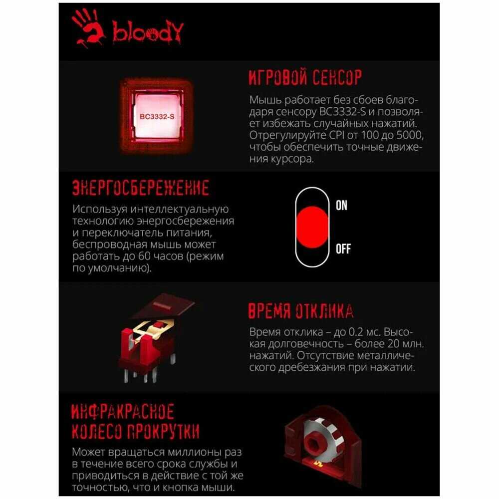 Взял себе на замену мышки A4Tech bloody V3, которую купил в каком-то бородатом году, не помню когда уже, но ОЧЕНЬ давно. Заменил я её лишь только потому, что захотел беспроводную. Т.е. та мышка V3, она полностью живая, вплоть до колёсика, которое даже не намекает на то, что начнет глючить или прокручивать вхолостую. Убедившись в надежности производителя, решил взять от него же данную беспроводную мышь, пока всё также замечательно, надеюсь прослужит столько же и будет заменена не из-за выхода из строя.