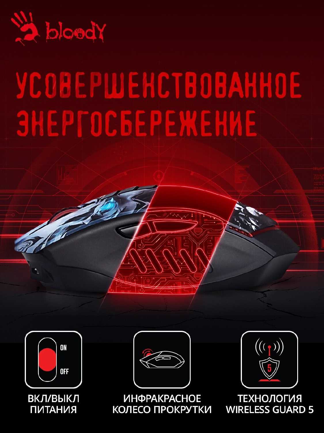 беспроводная, легко обучаемый детальный хороший софт для настройки мыши, легко разобрать для чистки, долго держит заряд без подсветки - с подсветкой, работает на любой поверхности если настроить в софте, можно настроить так чтоб мышь выключалась если не работает пользователь, мышка даёт преимущество в играх