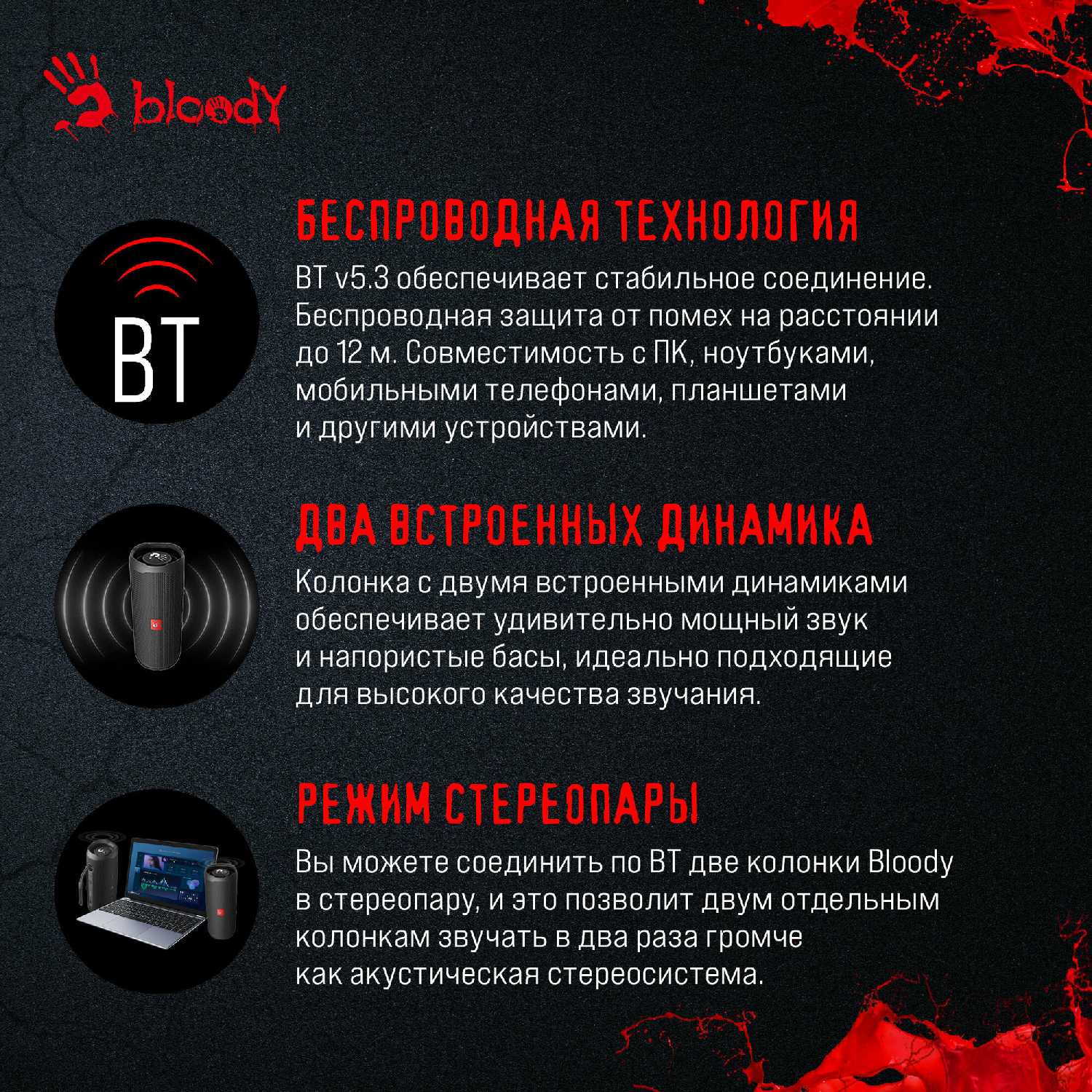 UPD. Взял также Xiaomi Sound Outdoor 30W, качество звука у Bloody получше. Больше средних и высоких, особенно на небольшой громкости (у Сяоми перебор в сторону низких частот), но у Сяоми нет нюанса с громкостью и ниже задержка звука.