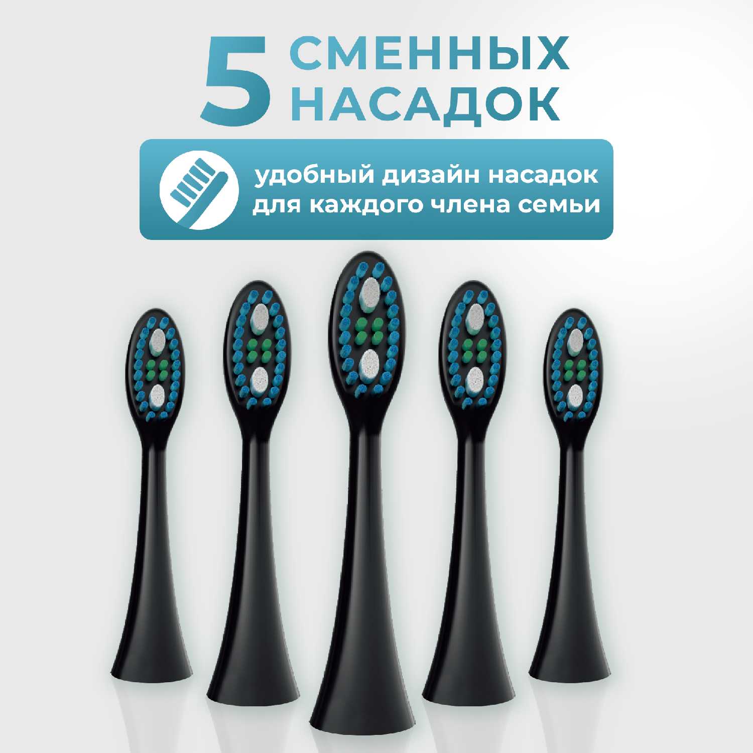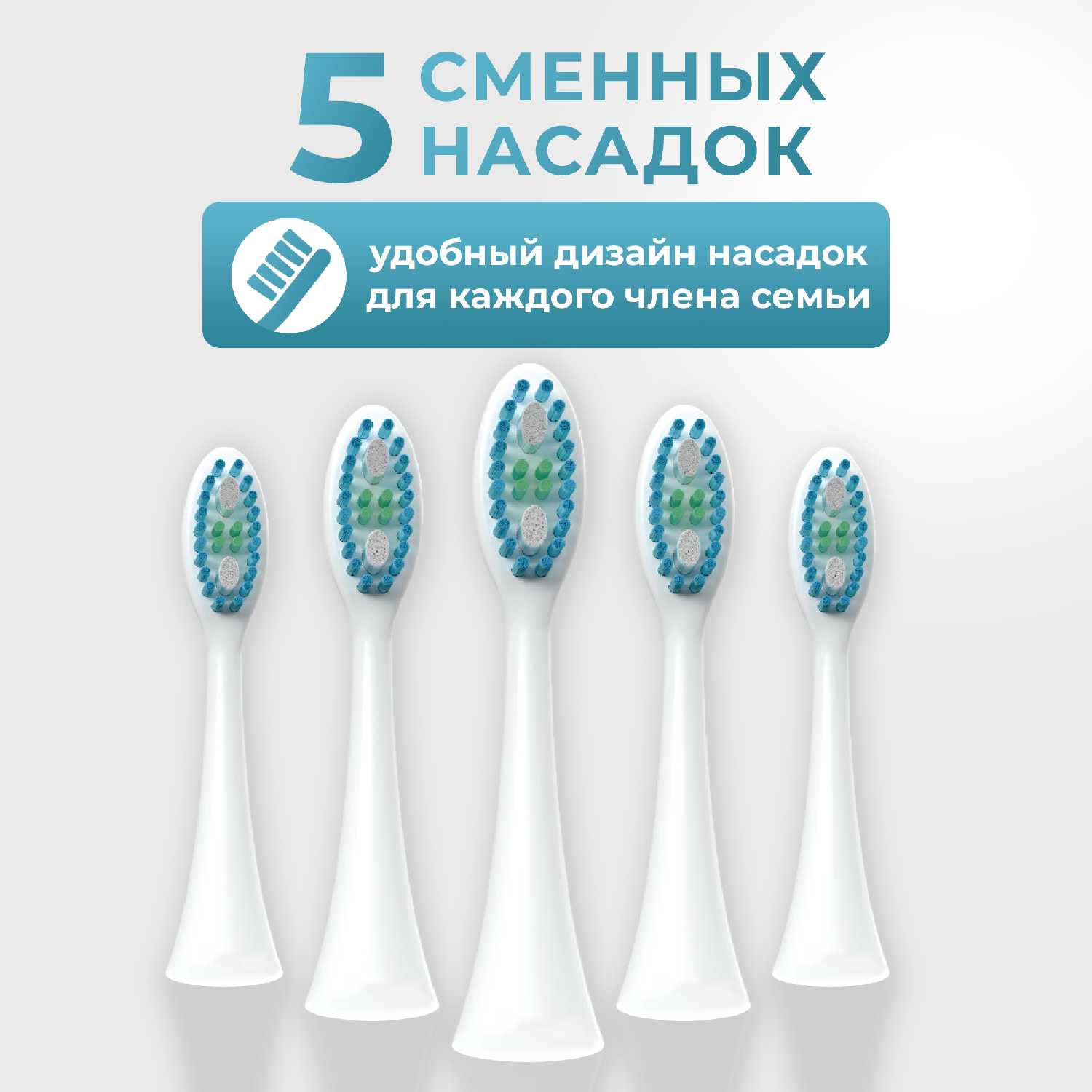 - 5 сменных насадок в комплекте рассчитаны на 18 месяцев использования семьей из 2 человек.