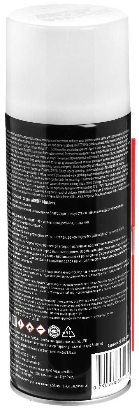 Способ применения : | хорошо встряхните баллон перед использованием. Обрабатываемая поверхность должна быть сухой и чистой. При распылении держите баллон вертикально на расстоянии 25 см от поверхности. Нанесите смазку тонким ровным слоем. Для создания защитного слоя на металлической поверхности нанесите смазку и удалите ее излишки салфеткой |