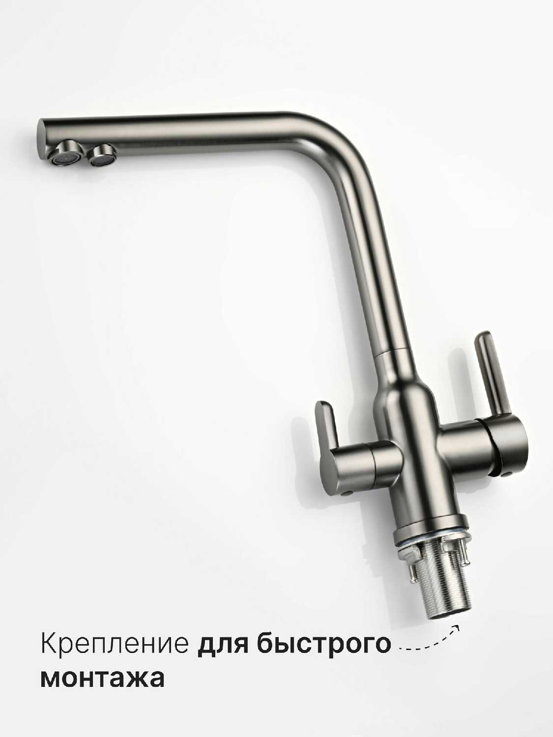 Красивый, стильный смеситель. Удобно, что есть подключение к фильтру, не надо устанавливать второй кран и делать отверстия в раковине.