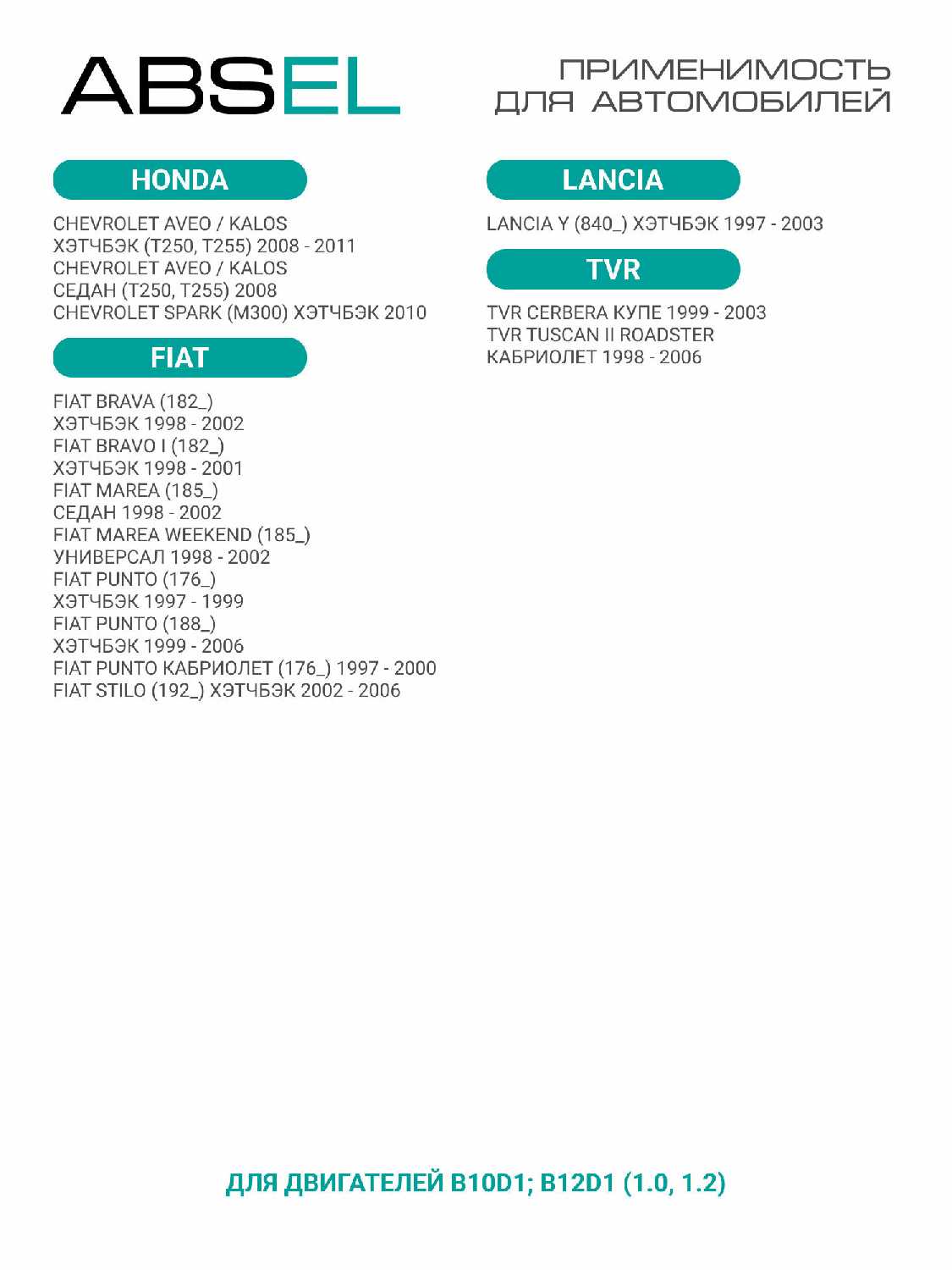 Модель автомобиля : | Chevrolet Aveo, Chevrolet Spark, Fiat Brava, Fiat Bravo, Fiat Marea, Fiat Punto, Fiat Stilo, Lancia Y10, TVR Tuscan |