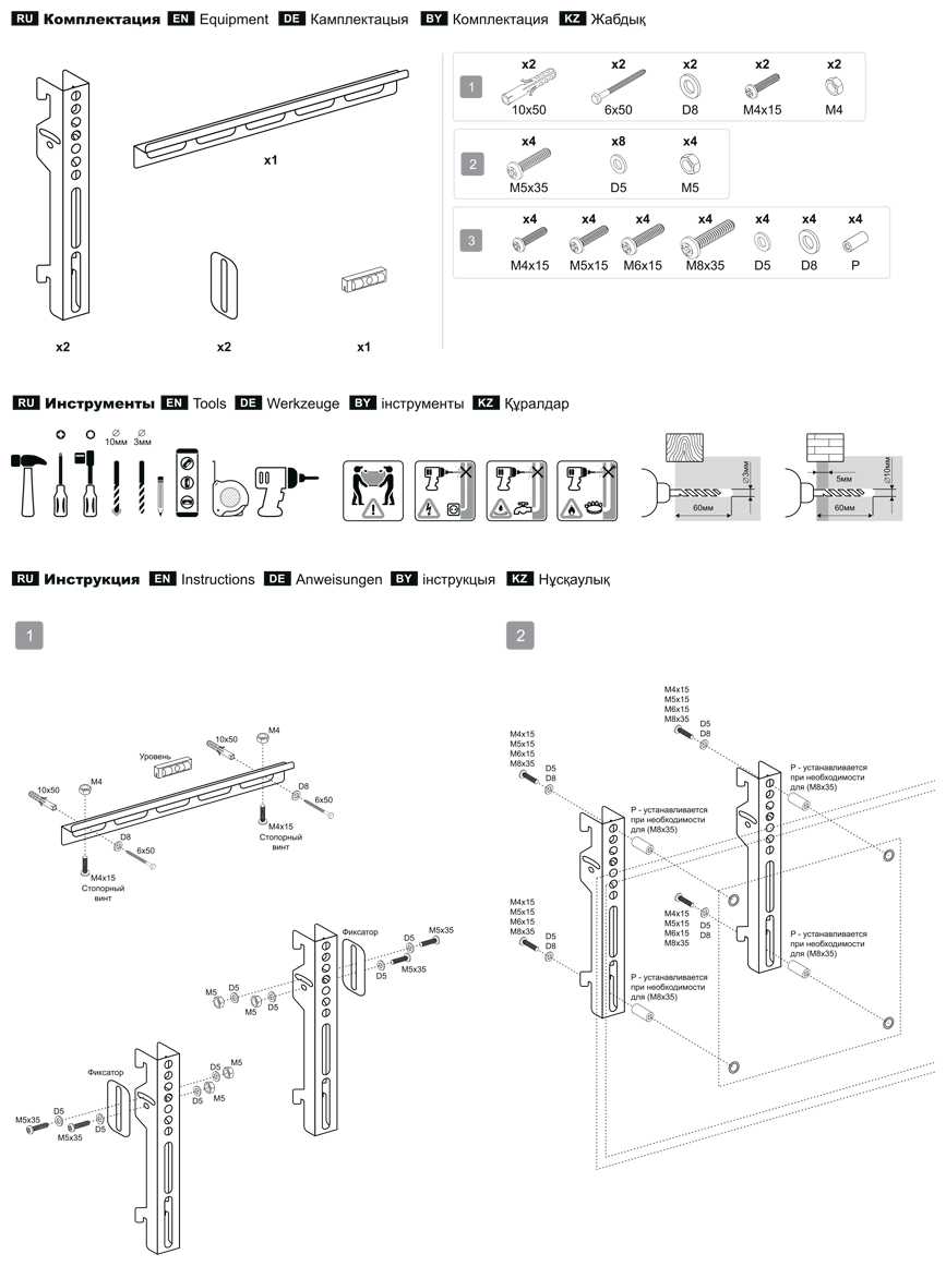 | Дополнительная информация : | Комплектация: коробка, инструкция, кронштейн, монтажный комплект, пластина крепления к ТВ-2шт пластина опорная настенная-1шт, фиксатор-2шт уровень-1шт дюбель 10х50-2шт шуруп 6х50-2шт шайба D8-2шт, винт М4х15-2шт гайка М4-2шт винт М5х35-4шт шайба D5-8шт гайка М5-4шт, винт М4х15-4шт винт М5х15-4шт винт М6х15-4шт винт М8х35-4шт шайба D5-4шт, шайба D8-4шт заглушка пластмассовая-4шт |