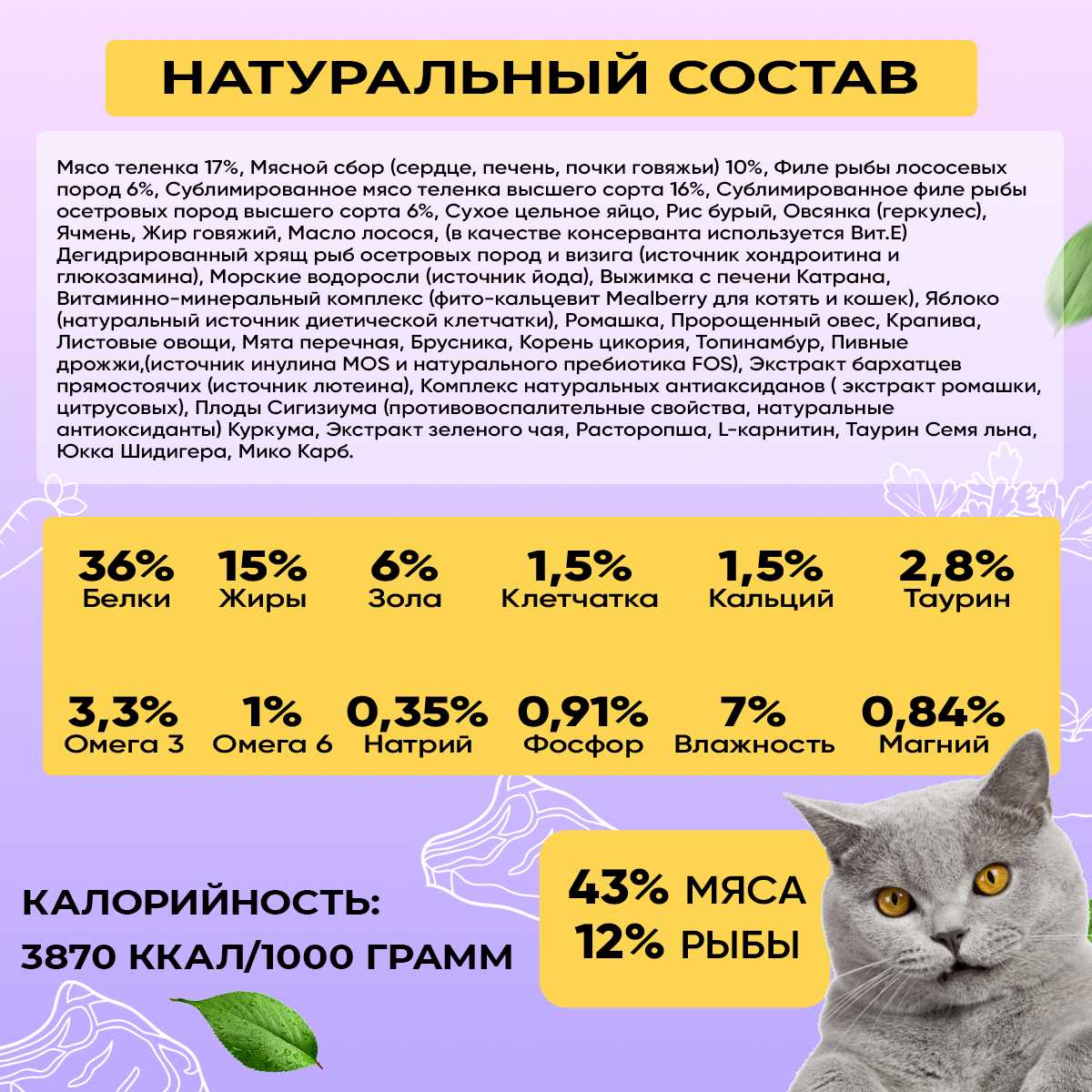 | Особые потребности : | гипоаллергенный, для беременных / кормящих кошек, для живущих в помещении, для живущих на улице, для здоровья кожи и блеска шерсти, для здоровья костей и суставов, для снижения запаха стула, для стерилизованных/кастрированных, профилактика МКБ, профилактика избыточного веса |