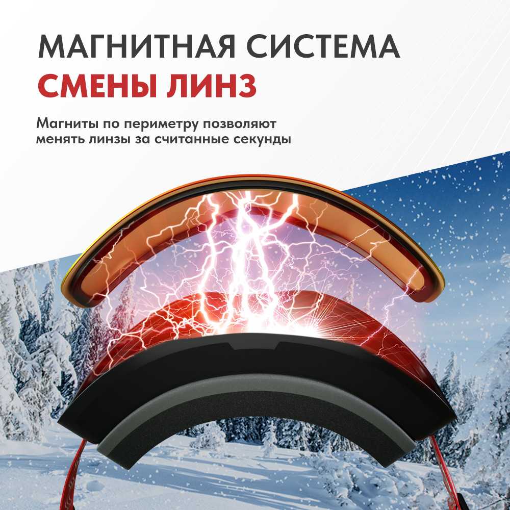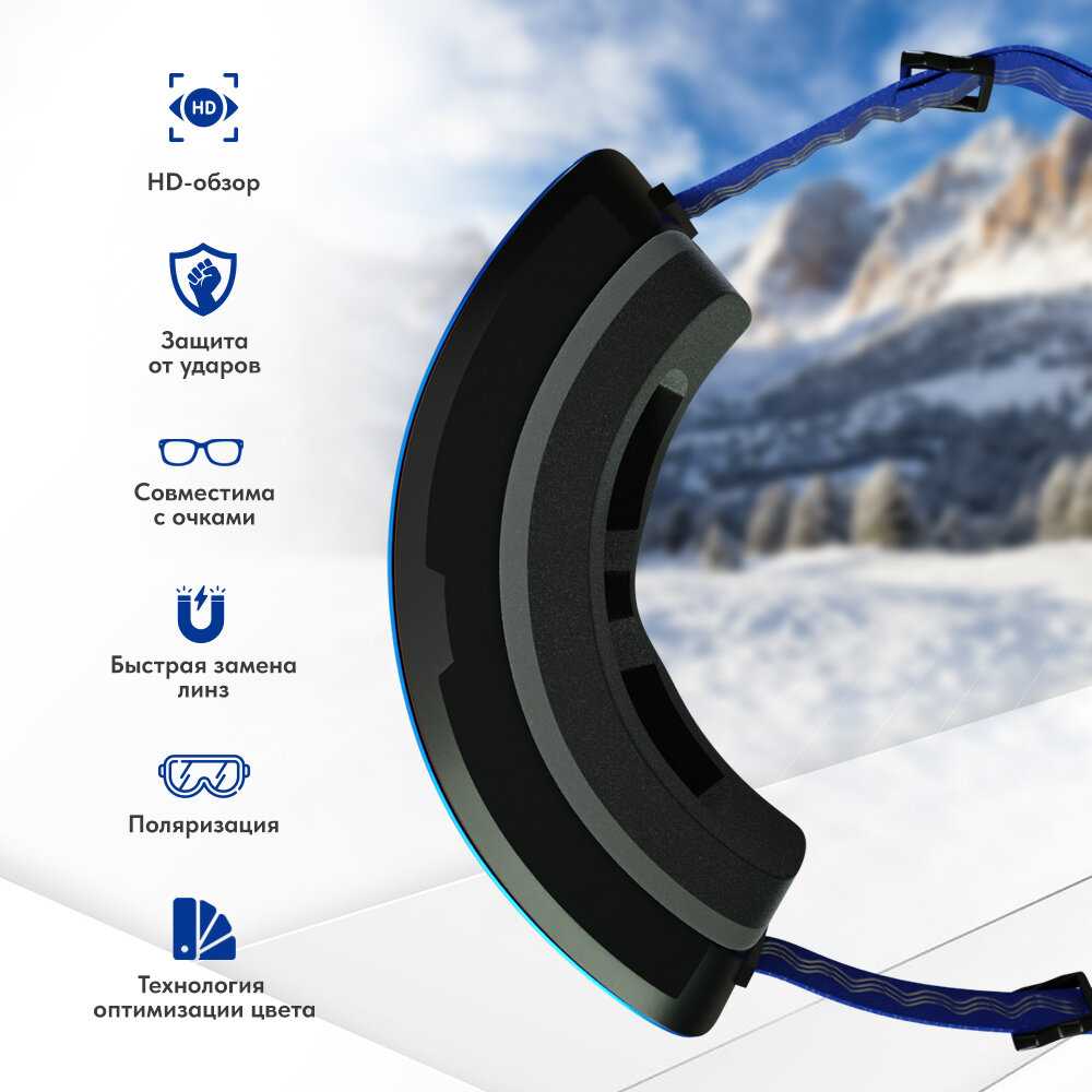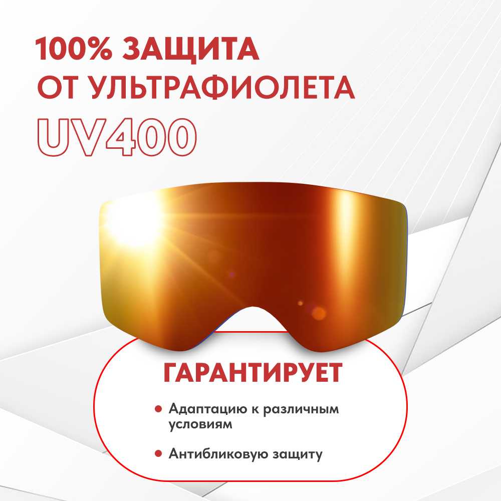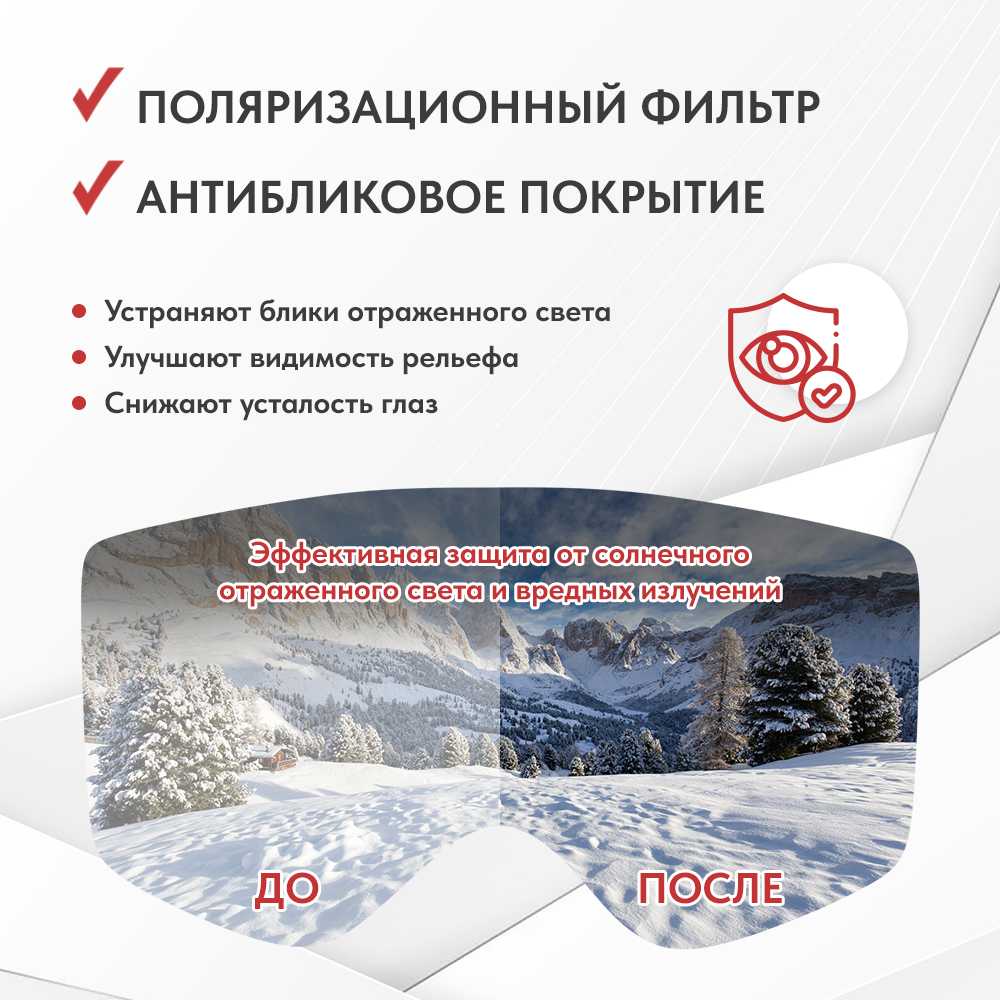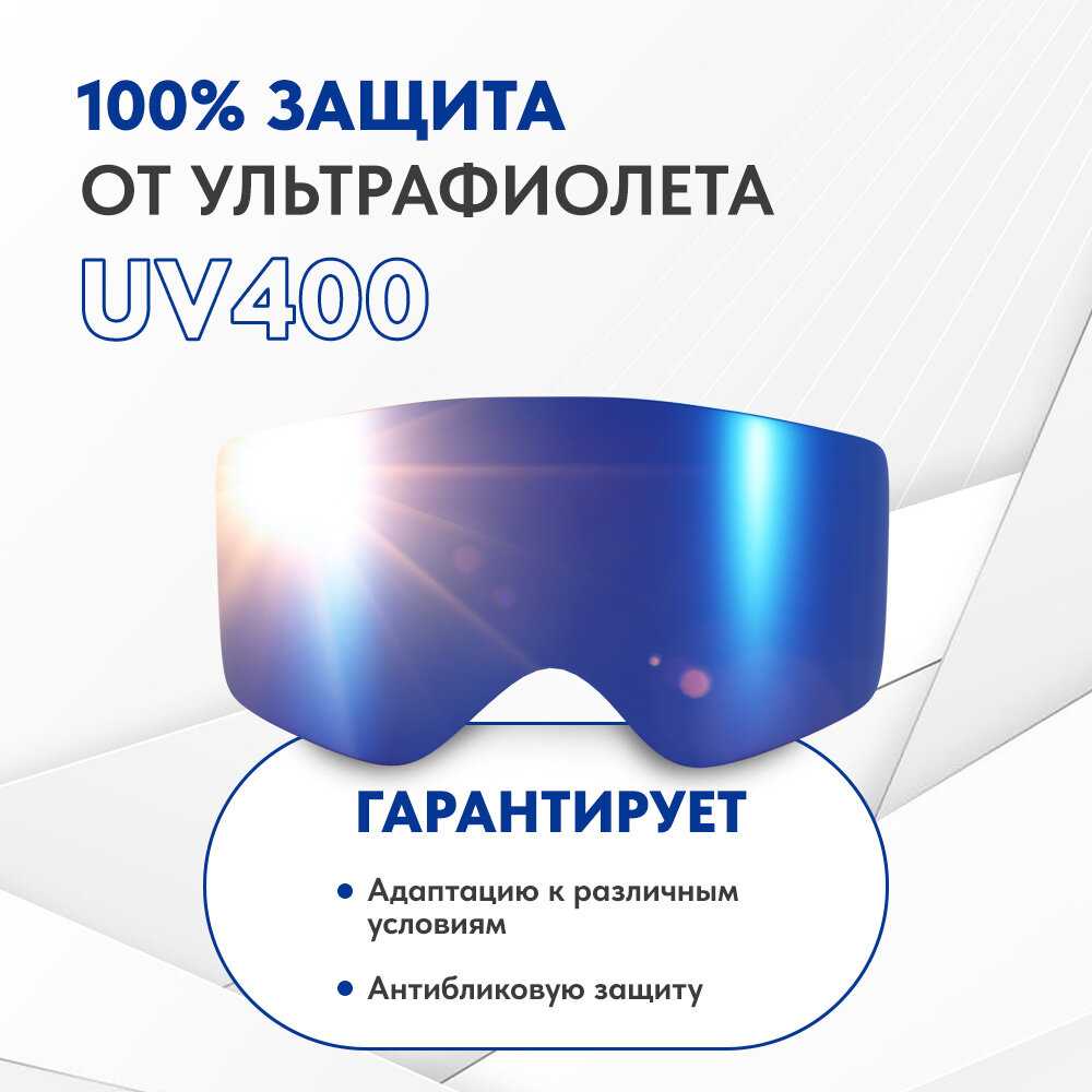 Особенности : | УФ-защита, быстрая смена линз, вентиляция, защита от запотевания, зеркальное покрытие, ношение поверх очков, поляризационный фильтр, съёмная линза |