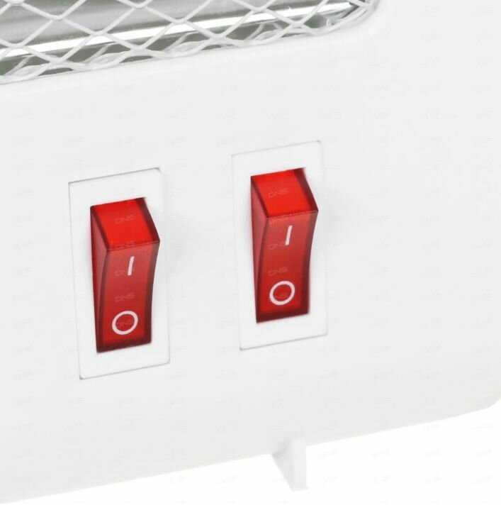 Конструкция обогревателя предусматривает два независимых нагревательных элемента, каждый из которых потребляет примерно 400 Вт. Благодаря раздельным выключателям можно активировать либо один элемент (режим 400 Вт), либо оба одновременно (режим 800 Вт). Эта функция позволяет гибко настраивать интенсивность обогрева в зависимости от потребностей и экономить электроэнергию. -