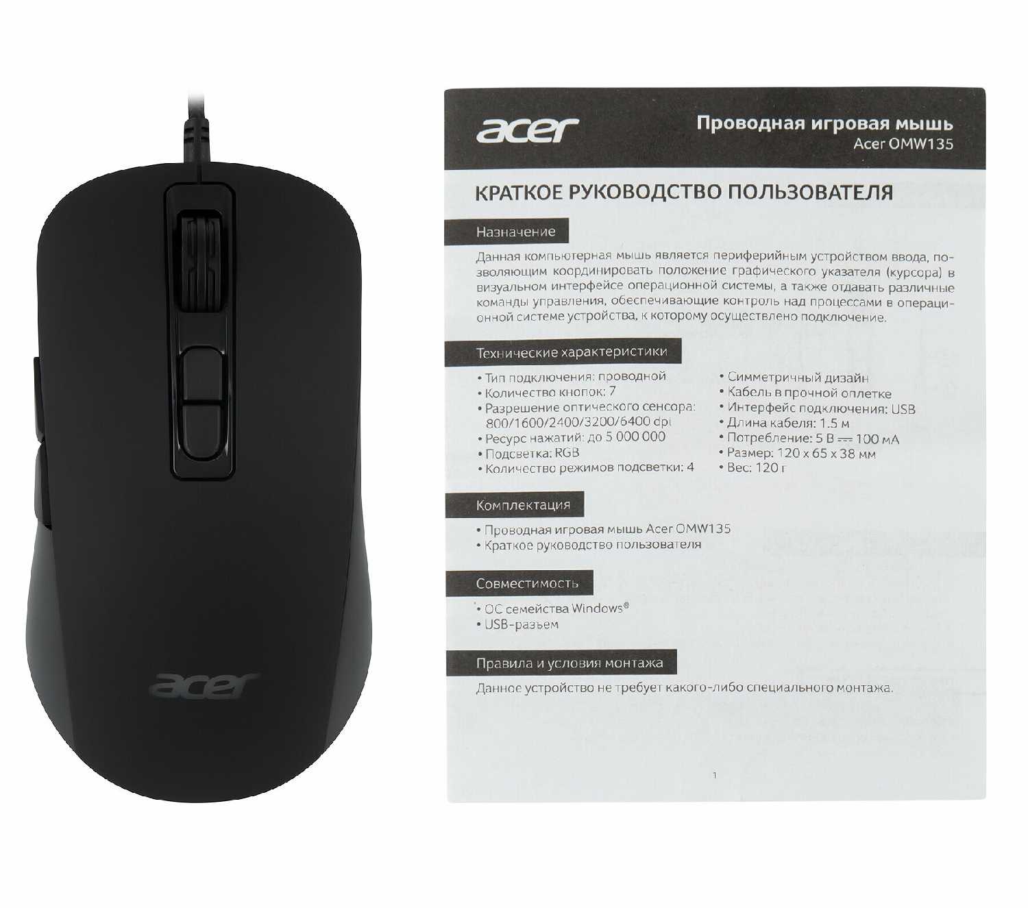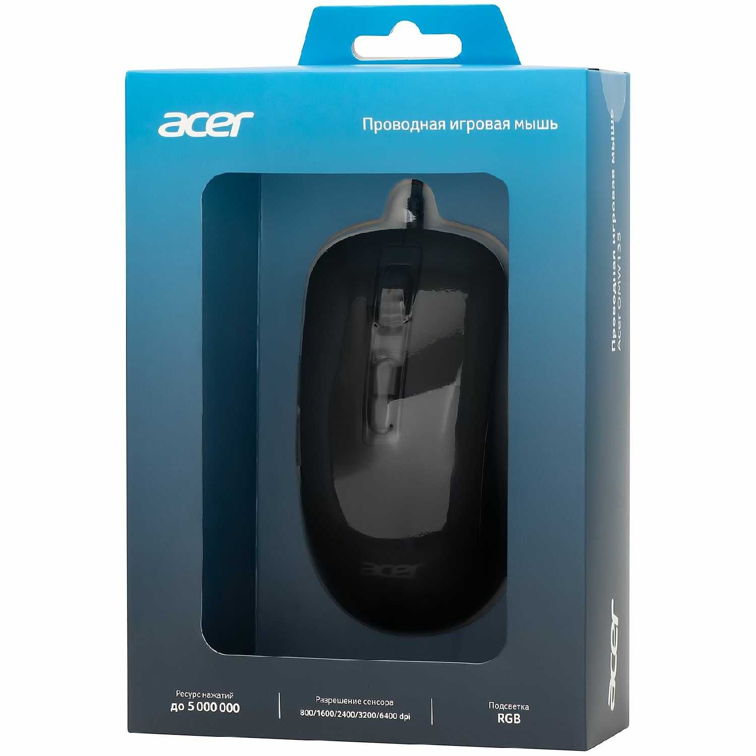 - + Игровая мышь Acer OMW190, представленная в черном цвете, привлекает внимание необычным дизайном. Ее корпус выполнен из пластика - легкого, прочного материала, устойчивого к механическим повреждениям.