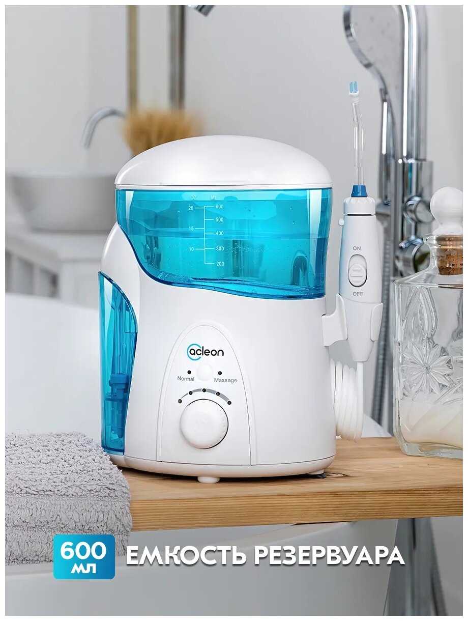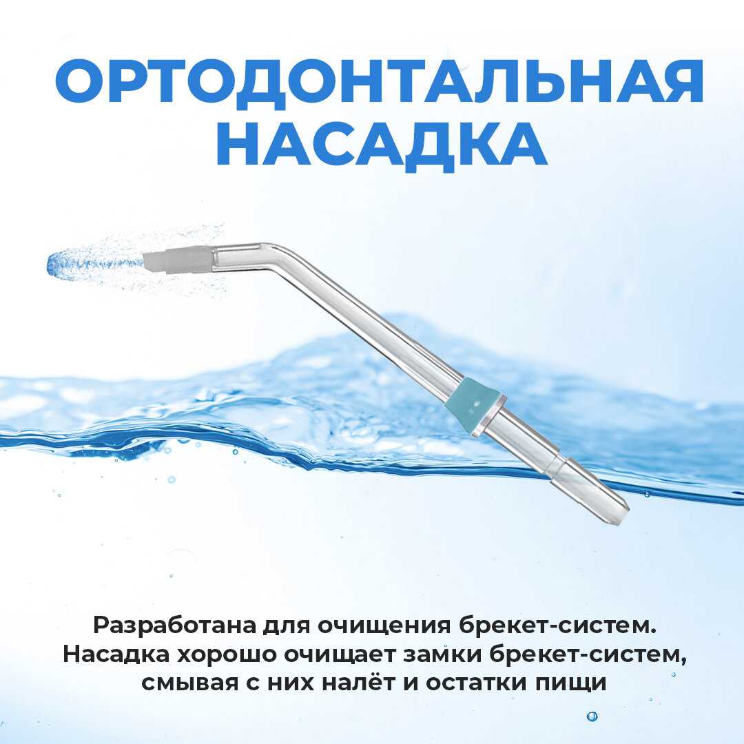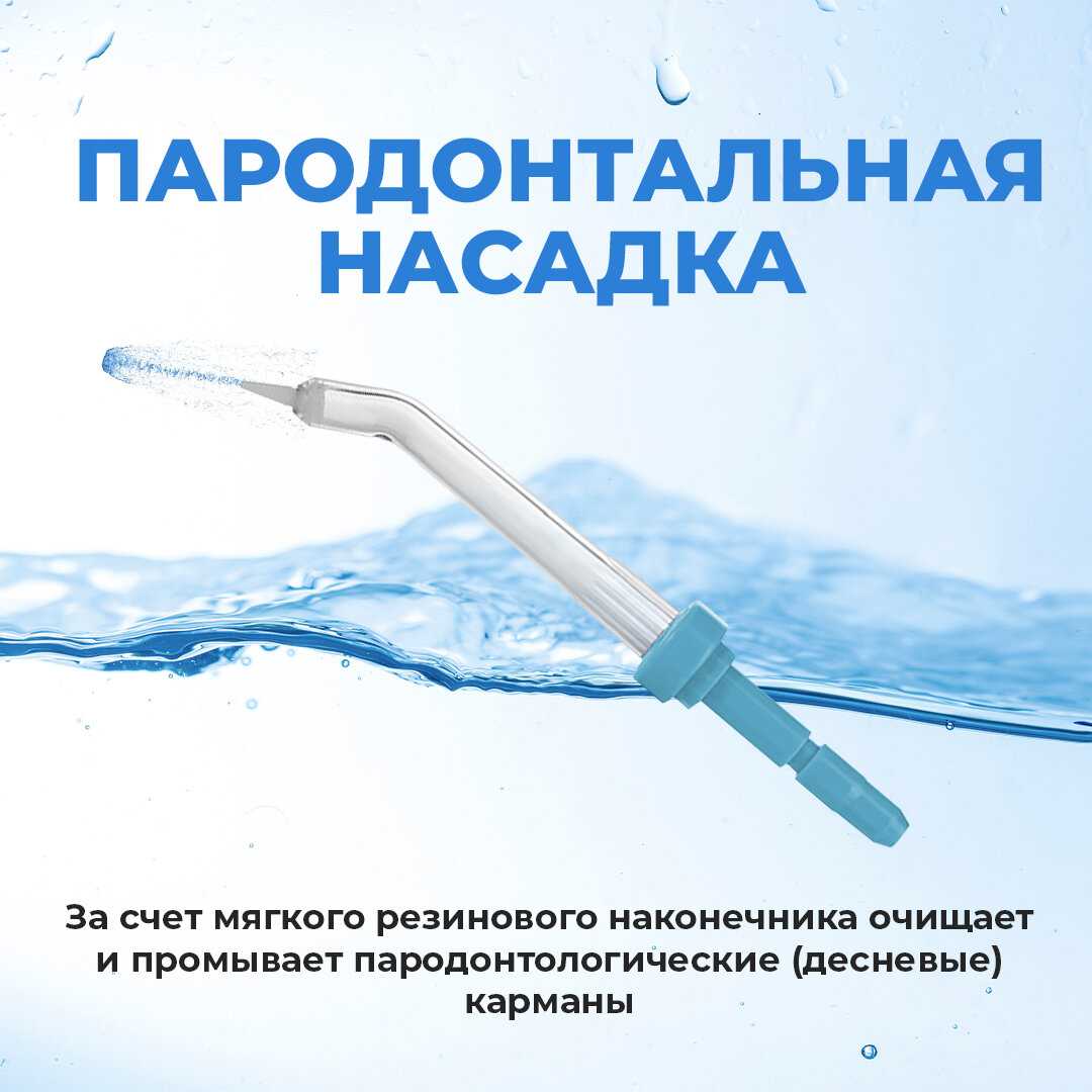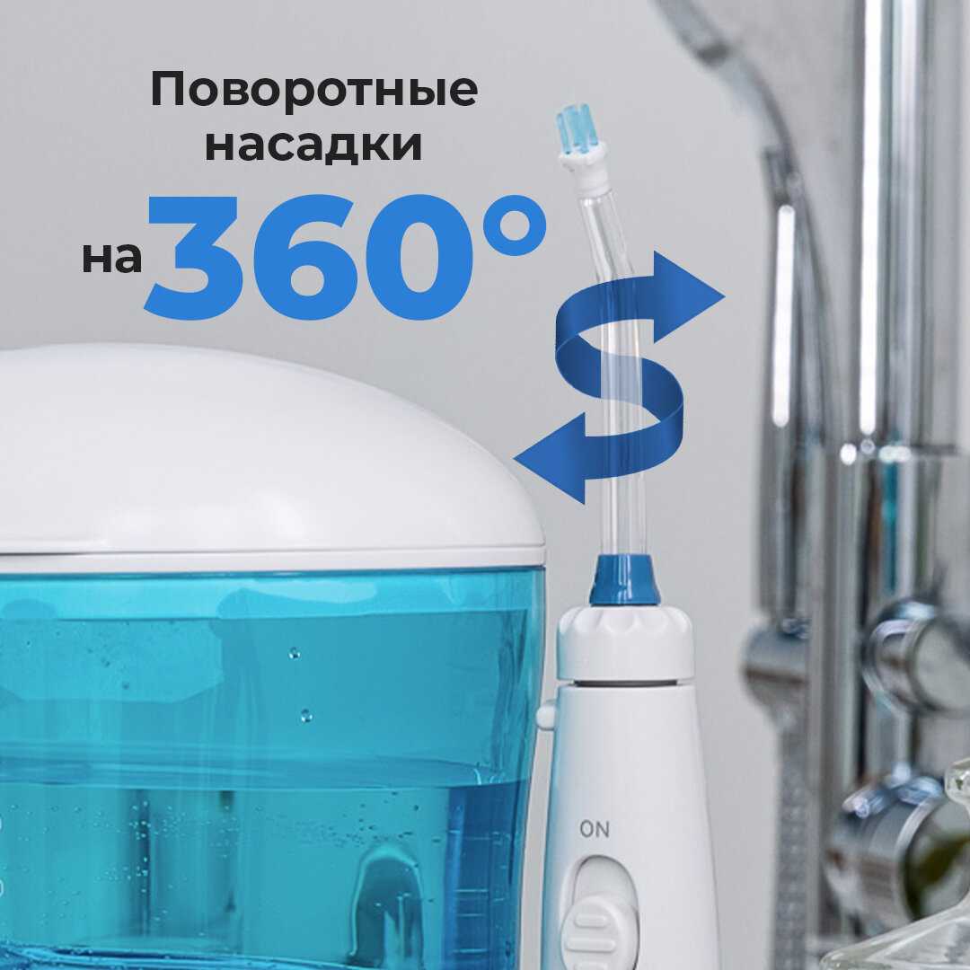 Ирригатор с большим, вместительным баком на 600 мл. Объёма хватает на несколько чисток. Есть насадки различной формы и назначения. Отдельно встроен отсек для хранения насадок, с дезинфицирующей лампой. Насадки легко меняются, не теряют внешний вид. Можно корректировать силу напора струи, есть отдельно встроенные режимы.