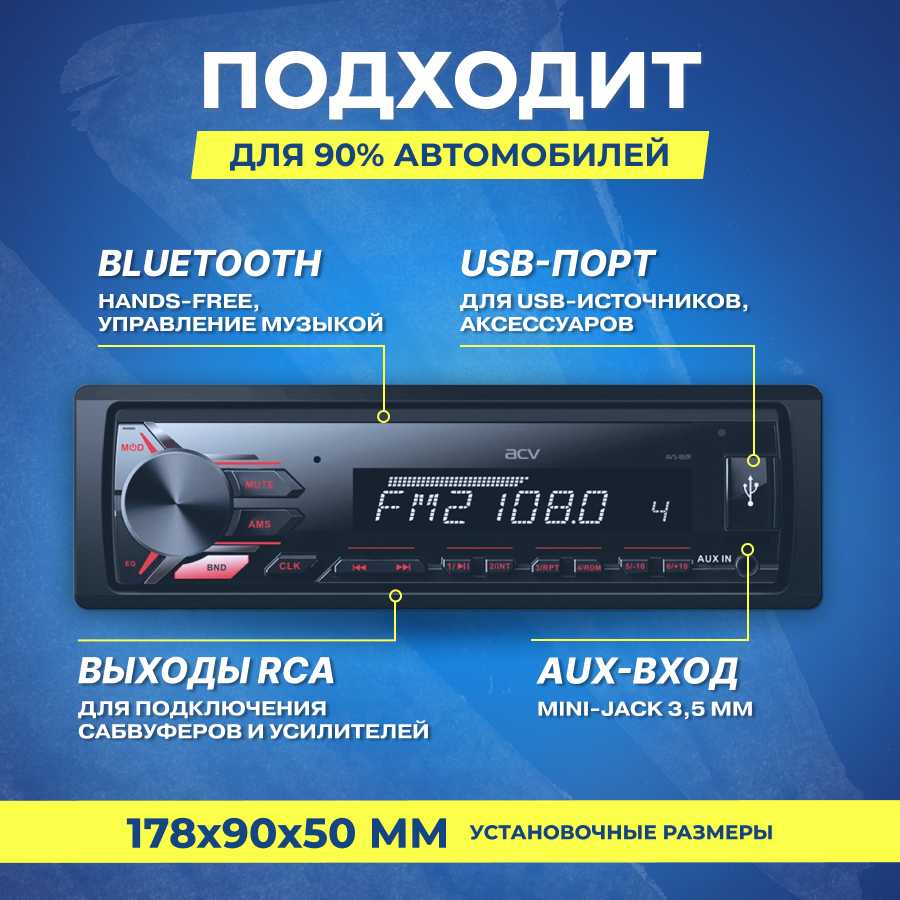 - Играет чисто с USB, SD-карт и AUX, улучшает звук в Lada Granta или рабочих машинах по сравнению с кассетными магнитолами.