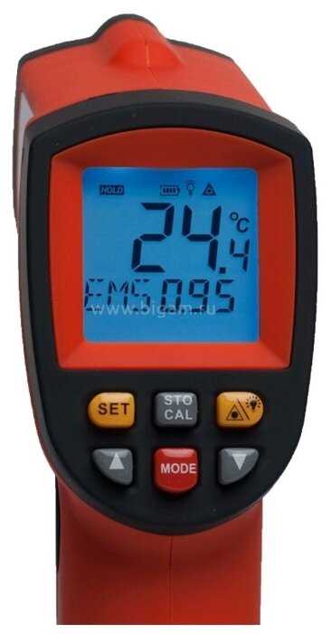 - + Точность измерений довольно высокая (температура тела в области шеи показывает 35,5 градуса), качественный пластик, большой диапазон измерений (от -50 до +900 градусов). Качественный дисплей.