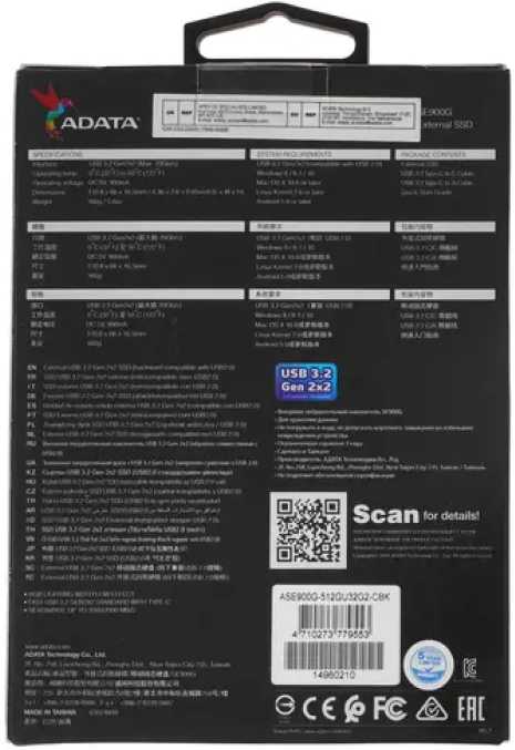 Конструкция и дополнительные особенности:Корпус из алюминия с рёбрами жёсткости обеспечивает защиту от физических повреждений, но увеличивает вес. Радиатор, встроенный в дизайн, снижает температуру на 5–10°C, однако его невозможно снять без риска повреждения. Комплектные кабели (USB-C/USB-A) поддерживают скорость до 10 Гбит/с, но при использовании некачественных переходников скорость падает в 8–10 раз. RGB-подсветка, упомянутая в отзывах, отсутствует в данной модели — видимо, путаница с другими линейками ADATA. Из минусов — отсутствие информации о типе памяти (TLC/QLC) и контроллере в официальных спецификациях.