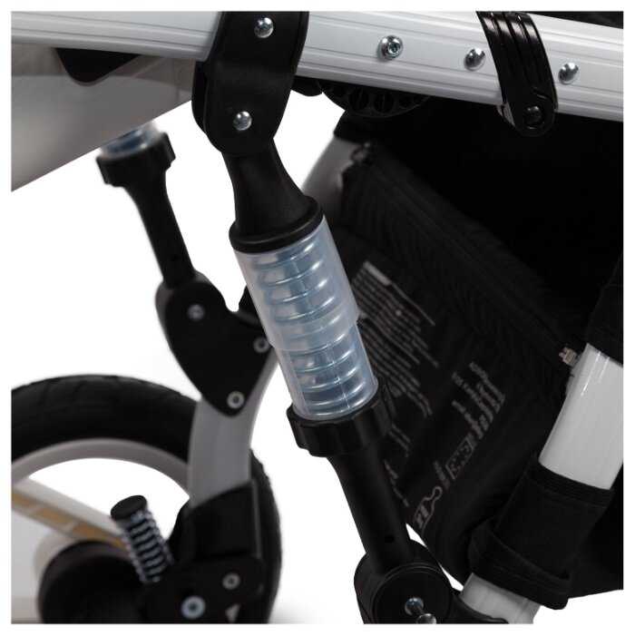 - + Очень мягкая коляска за счёт амортизаторов не только на колёсах но и на среднем блоке между низом и верхом. Амортизация регулируется на всех установленных пружинах. Есть фиксаторы на задних колесах( о них не писали сама нащупала под амортизаторами и кругляшки на средних пружинах, которые регулируют необходимую мягкость амортизации). Коляска манёвренная, легкая. Носила с ребёнком на второй этаж..))