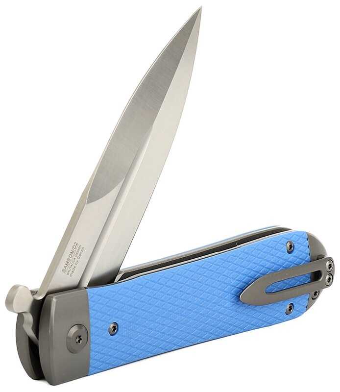 Ушки для открытия вместо традиционного шпенька, асимметричная форма в сложенном состоянии (из-за частично скрытого клинка) и стилизация под «римское копьё». Накладки рукояти имеют глубокую трёхмерную насечку, а клипса интегрирована в общий брутальный стиль. -