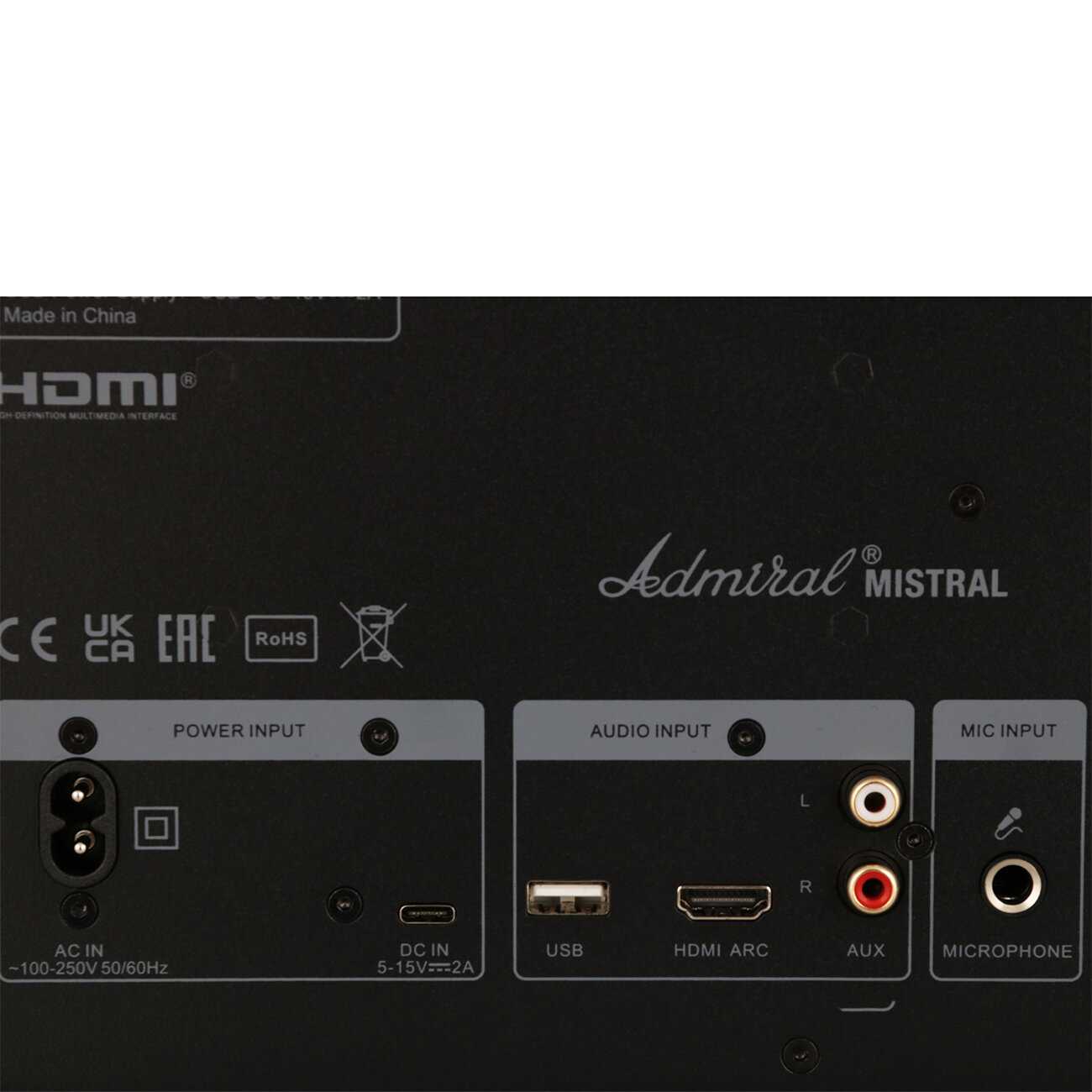 Подключение и управление: Bluetooth соединяется мгновенно с телефонами или планшетами без помех через стены, HDMI ARC с ТВ обеспечивает быстрый запуск без задержек для саундбара или фильмов, поддержка USB, AUX и микрофона для караоке. Кнопочное управление простое с эквалайзером, но переключение входов вручную вызывает бульканье, отсутствие пульта ДУ и авто-возврата на аудиовход усложняет использование с ТВ. Встроенный микрофон позволяет записывать звук или общаться, эквалайзер регулирует эхо и басы вручную.