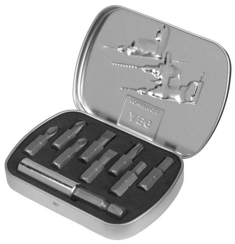 Дополнительная информация : | Набор состоит из 9 предметов: удлинитель-адаптер для бит, биты PH2 PZ2 PZ3 SL 4.5 SL 5.5 TX 25 Hex 4 Hex 5. |