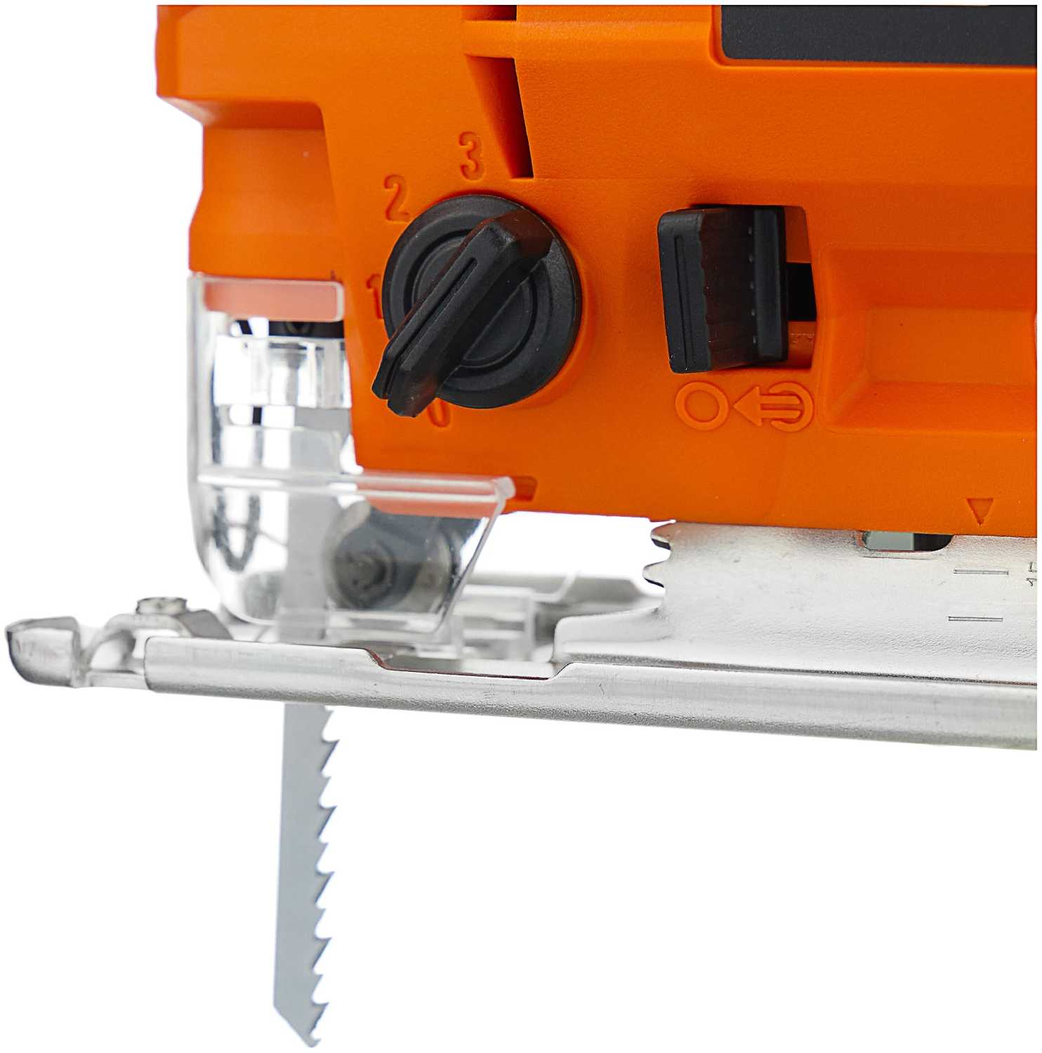 Выбирал строительный лобзик с мощностью 700 W. Выбор пал на этот. Оптимальная цена и качество.Достоинства:Мощность 700 W (У старого лобзика мощность 450W. Реально не хватало).Штампованная стальная станина.(Алюминиевую приходилось очищать от заусенцев после резки металла.)Угол резки не надо выравнивать по угольнику.Есть зубья фиксации. Есть вставка для чистого реза без сколов. Проверил. Эффективна! Отличный сдув опилок. Резиновый кабель 4 метра!Блокиратор пусковой кнопки.Низкая вибрация.Ровный угол распила.Проверял на доске 2,5 см.