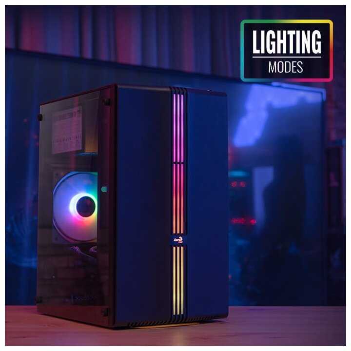 - RGB-подсветка вентиляторов (не ARGB) создает визуальную глубину при затемненном интерьере благодаря синхронизации цветовых схем.